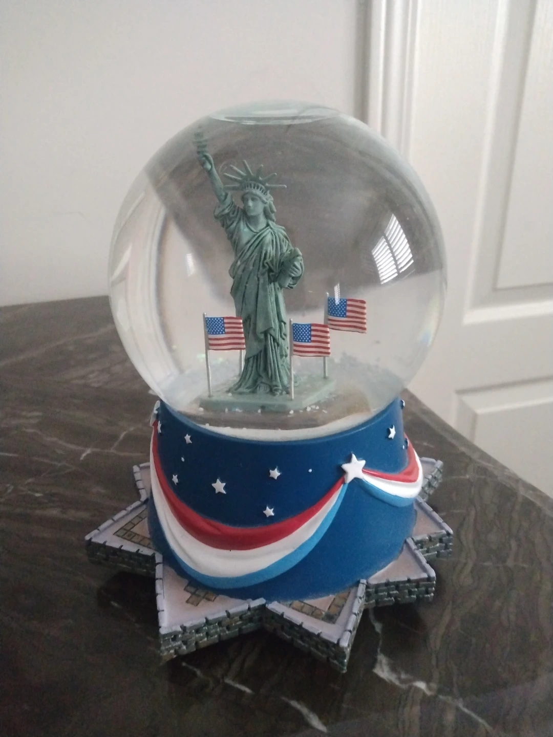 Selling a Statue of Liberty snow globe. It features American flags and a star-spangled base. Perfect for collectors or as a decorative piece!