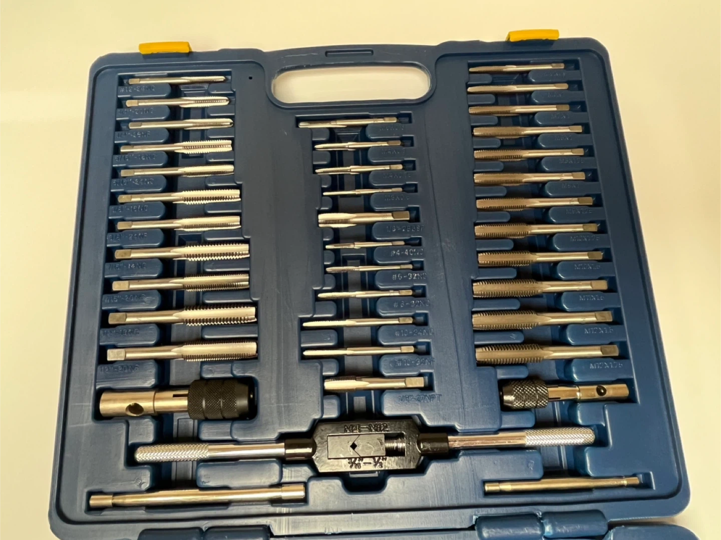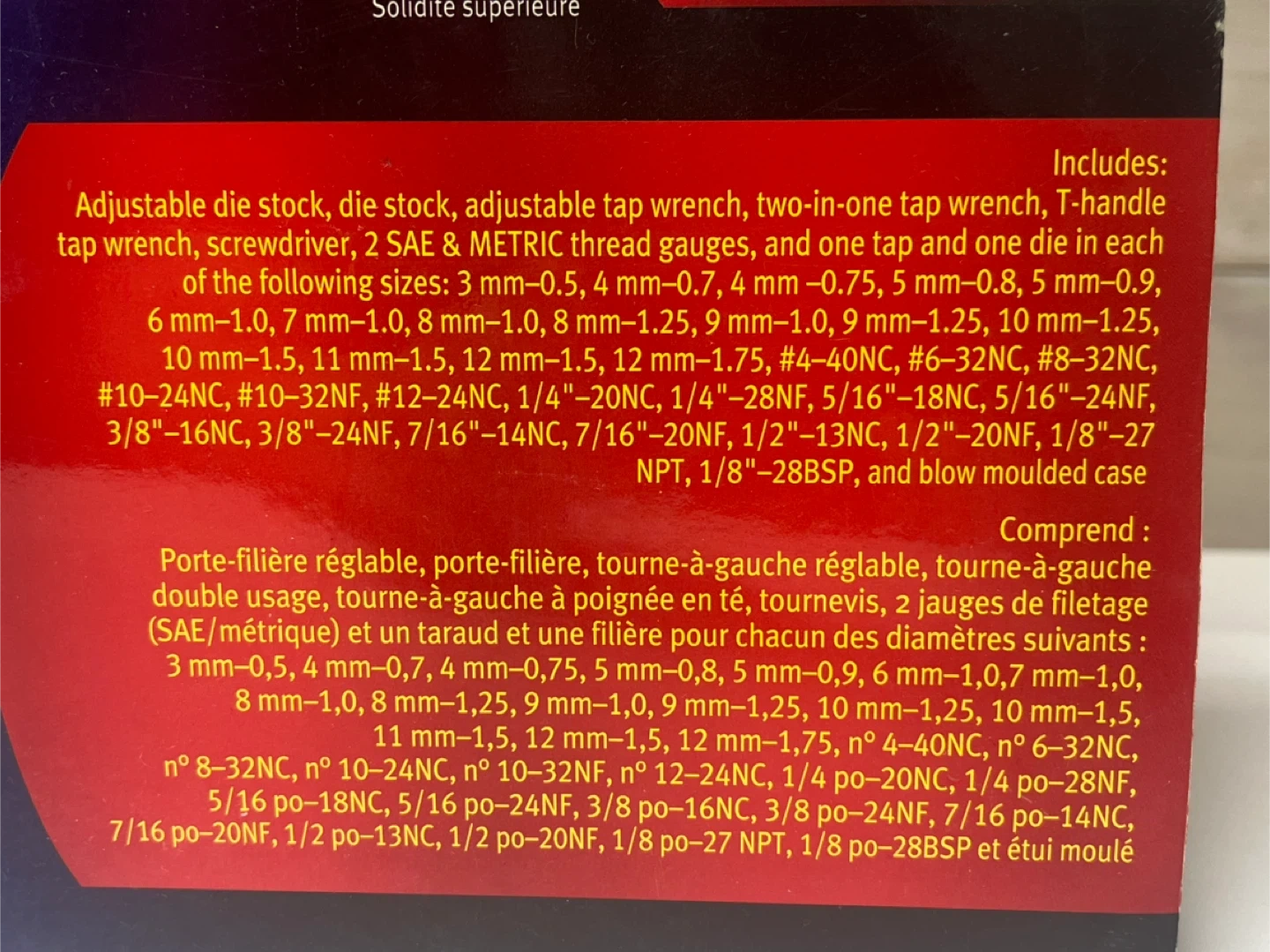 Selling a Brand New In Box Mastercraft Tap & Die Set with 76 pieces. It includes an adjustable die stock, die stock, adjustable tap wrench, two-in-one tap wrench, T-handle tap wrench, screwdriver, 2 SAE & METRIC thread gauges, one tap and one die in each of the following sizes: 3 mm–0.5, 4 mm–0.7, 4 mm –0.75, 5 mm–0.8, 5 mm–0.9, 6 mm–1.0, 7 mm–1.0, 8 mm–1.0, 8 mm–1.25, 9 mm–1.0, 9 mm–1.25, 10 mm–1.25, 10 mm–1.5, 11 mm–1.5, 12 mm–1.5, 12 mm–1.75, #4–40NC, #6–32NC, #8–32NC, #10–24NC, #10–32NF, #12–24NC, 1/4"–20NC, 1/4"–28NF, 5/16"–18NC, 5/16"–24NF, 3/8"–16NC, 3/8"–24NF, 7/16"–14NC, 7/16"–20NF, 1/2"–13NC, 1/2"–20NF, 1/8"–27 NPT, 1/8"–28BSP, and blow molded case
