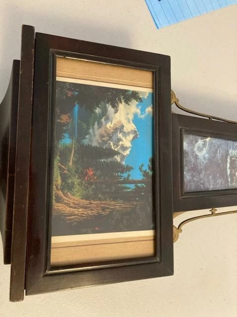 Contains original hand painted glass panels as well as pendulum and key.