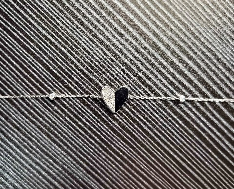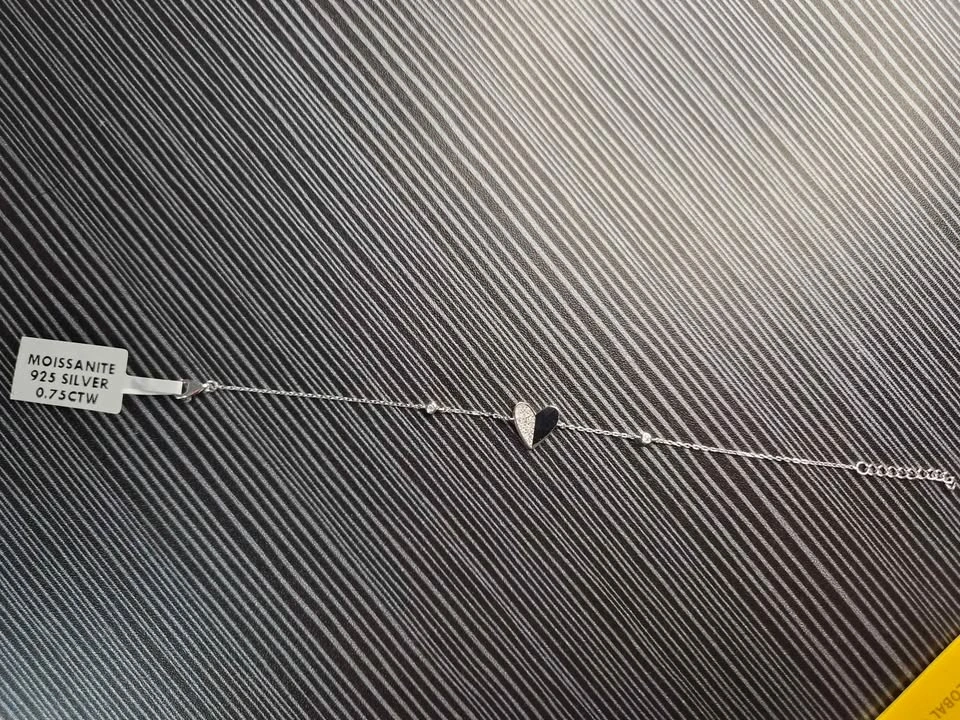 This 7-8" adjustable Moissanite Heart Bracelet is a stunning piece of fine jewelry made from 925 sterling silver. The bracelet features a cluster of lab-created white moissanite stones plus 2 moissanite bezels on either side of the heart with a total carat weight of 0.75, set in a chain style design. The bracelet is perfect for special occasions like Mother's Day, engagement, wedding, graduation, Christmas, anniversary, birthday, and Valentine's Day. It comes with a certification from GRA and is made in the United States, bringing a touch of elegance and sophistication to any outfit. Retails for $300 USD.