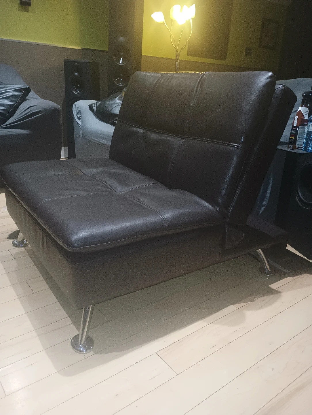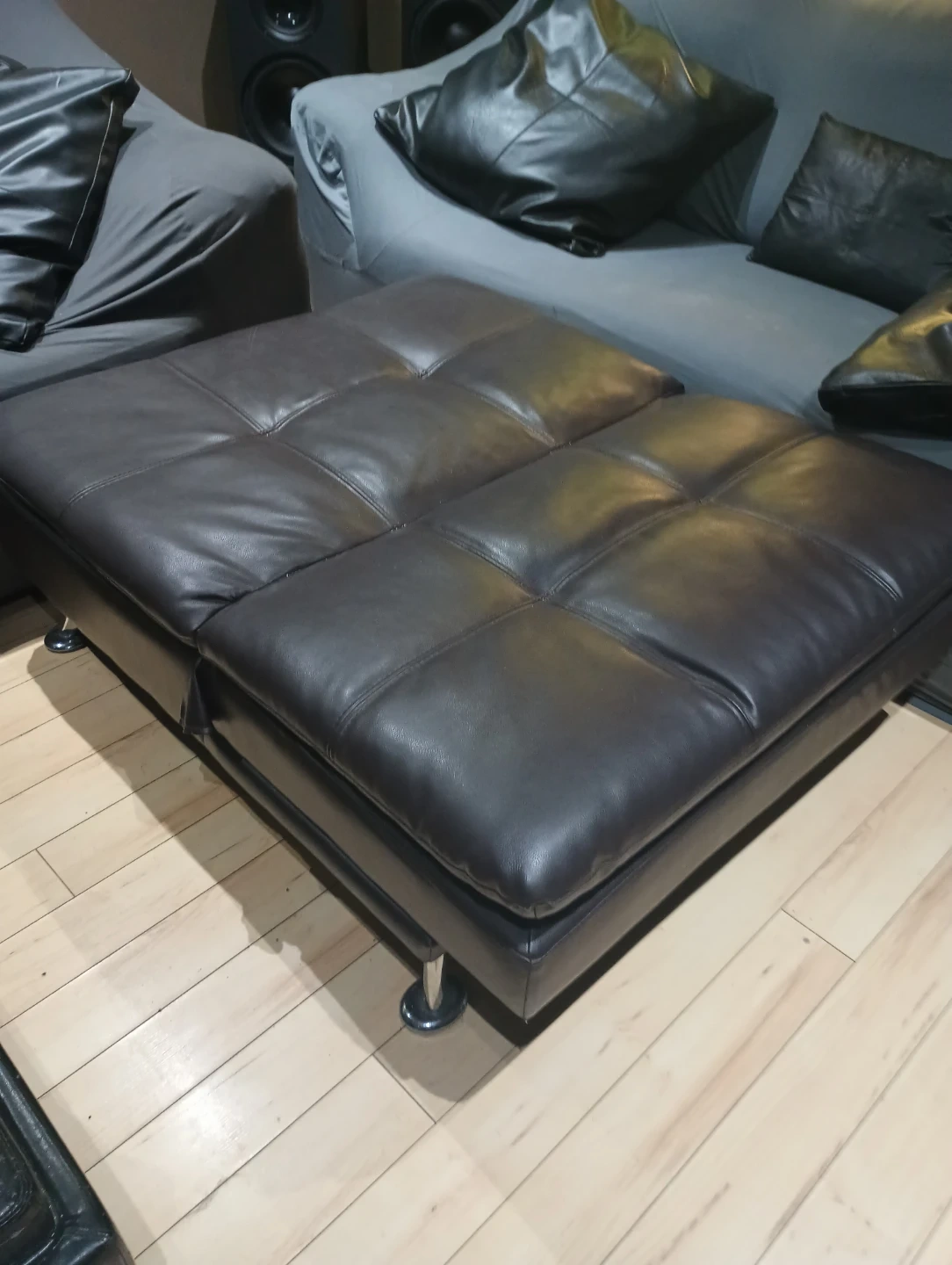 Bought for 400 on sale over the holidays it's great to extend your couch for extra seating or to push up against it for an ottoman or to create a lounge you can lay down and put your legs up on. This feature also makes it really easy to move. Beautiful leather and chrome feet. I didn't notice the color didn't match our other couches until I got home and saw it under our lighting. 5878911430.
