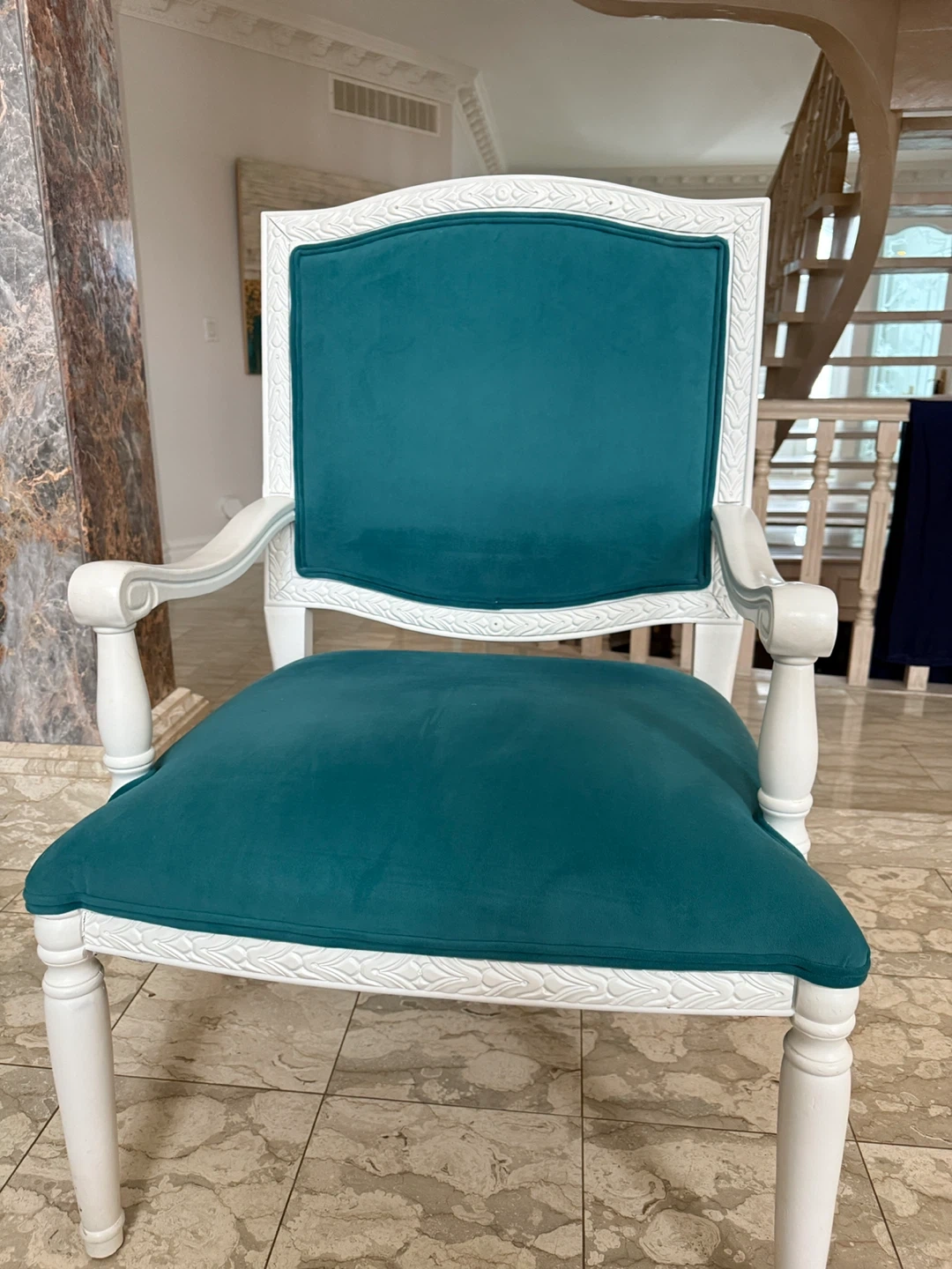 Selling a beautiful teal velvet accent chair! It features a white frame and a plush velvet seat and back. Perfect for adding a pop of colour and elegance to any room in your home. The chair is in excellent condition and ready to be enjoyed