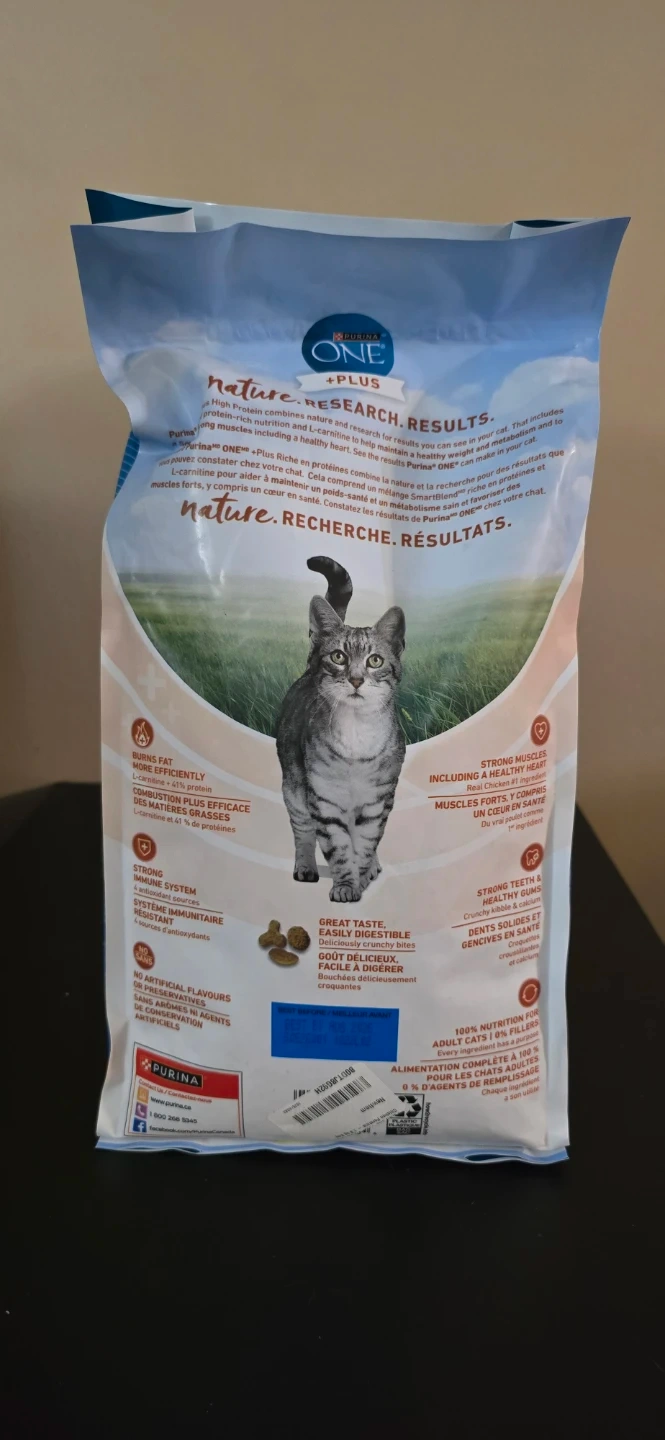 Selling a bag of Purina ONE +Plus High Protein cat food. It's a complete and balanced nutrition for adult cats. Helps maintain a healthy weight and is easily digestible. Contains real chicken and other wholesome ingredients. Net weight is 1.8 kg