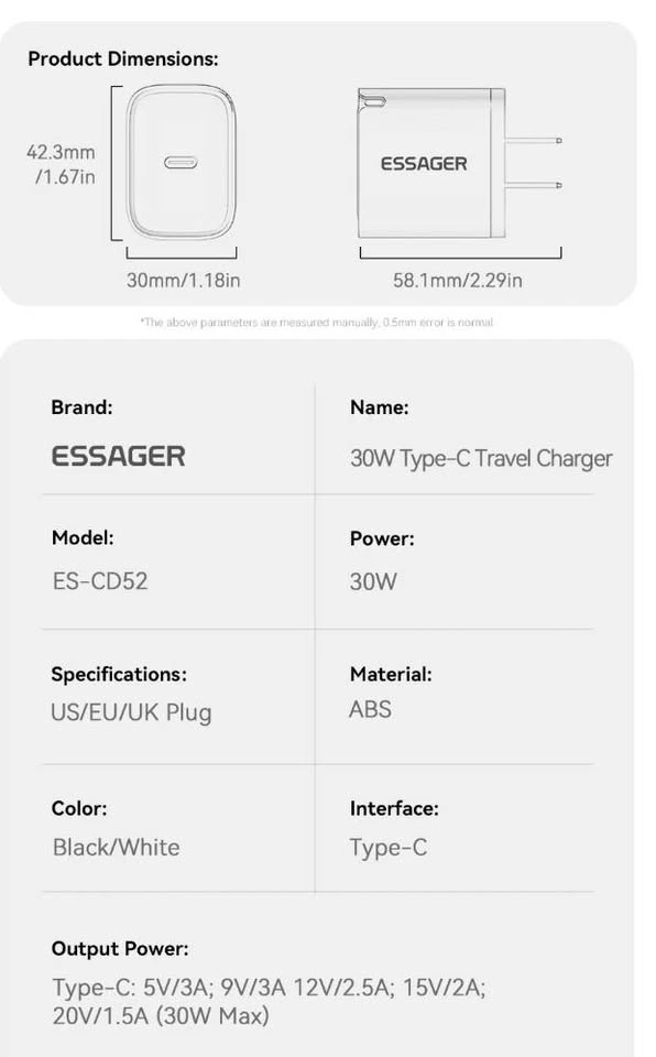 Essager Mini 30W Type C Charger PD QC3.0 Fast Type C Charger