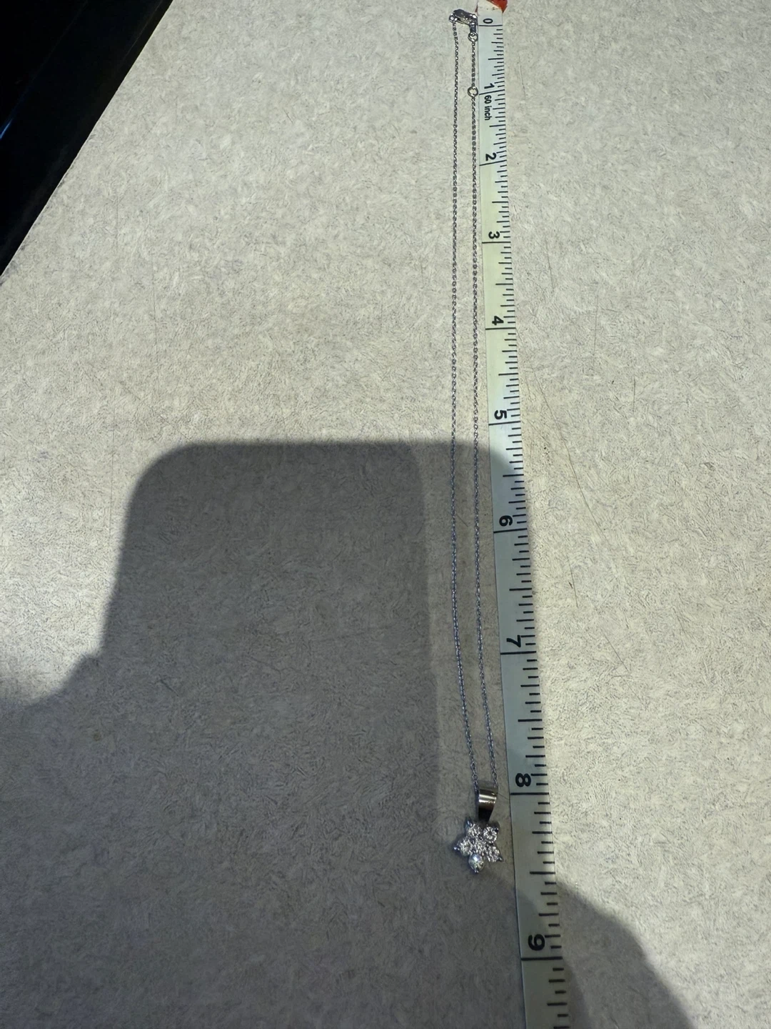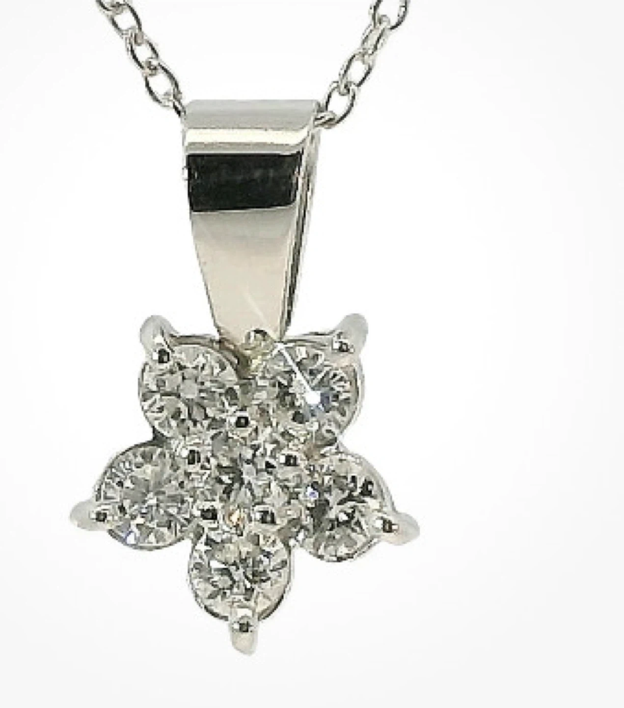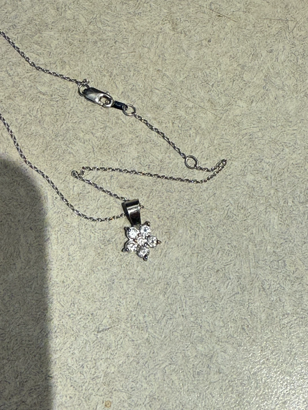 A delicate natural 0.60 karat diamond flower pendant with necklace. The necklace has a lobster clasp. The clasp is marked "PLAT". The pendant is approximately 1cm in size. Pendant has hallmarks 950 but it’s hard to take a picture of that.