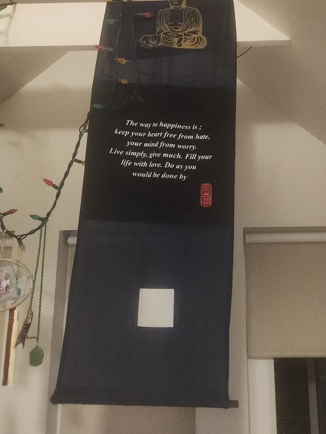 This wall hanging features a Buddha image and an inspirational quote about happiness and living simply. It's a unique piece to add a touch of serenity to your space. The colours are black, gold and white.