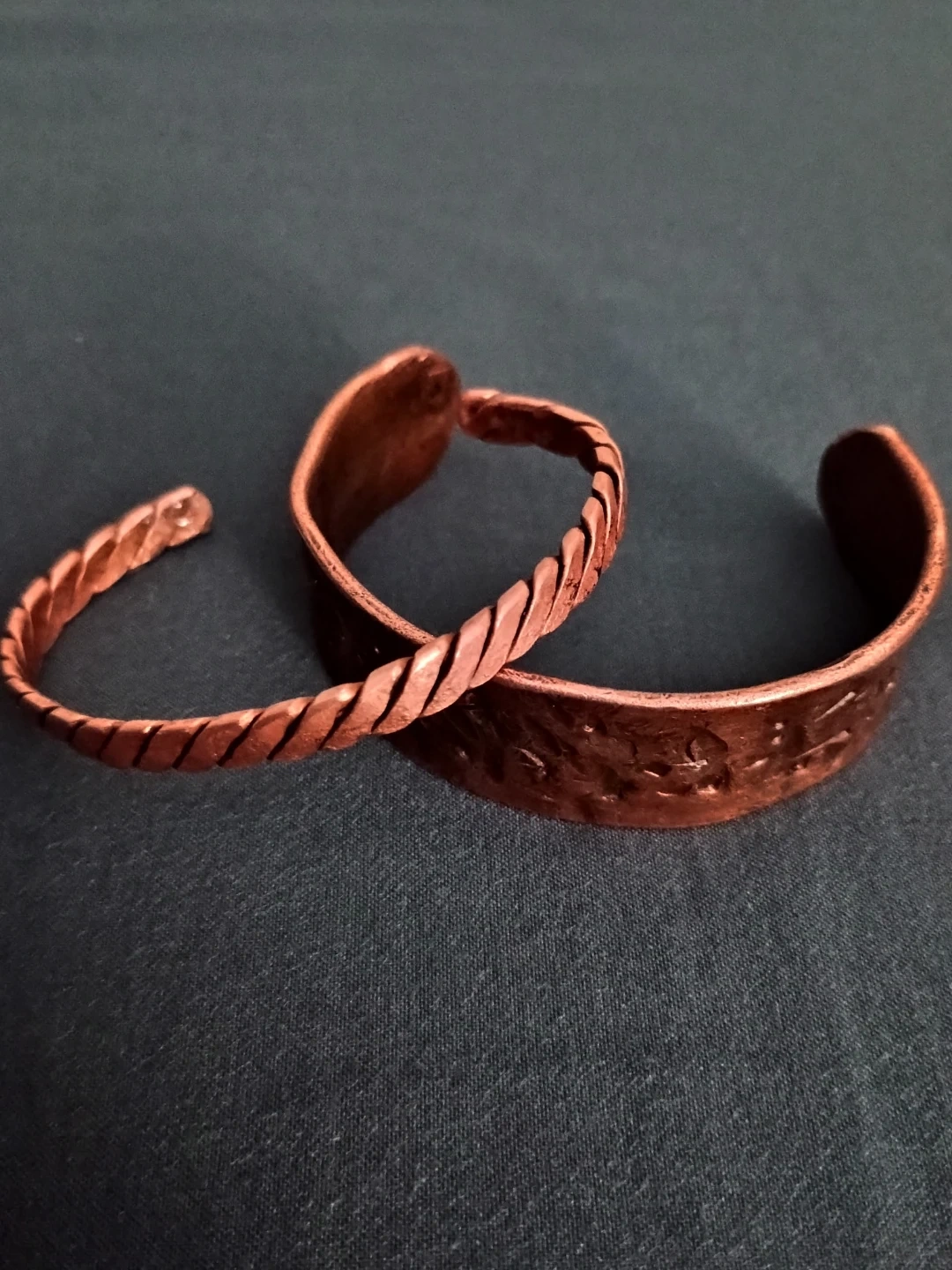 Selling a set of two handmade copper bracelets. One is a twisted design, and the other has an etched pattern. They're in great condition and ready to wear! Great for arthritis