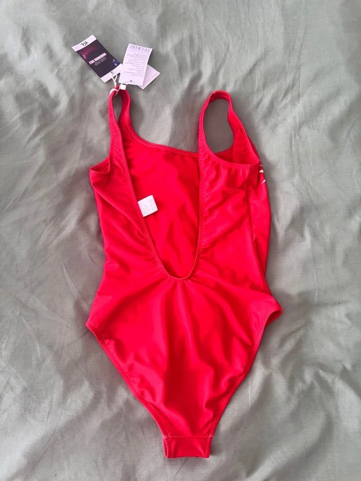 Brand new with tags. Size small, red front logo and open back one piece swim suit.