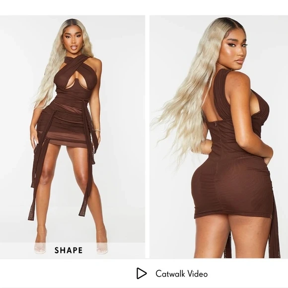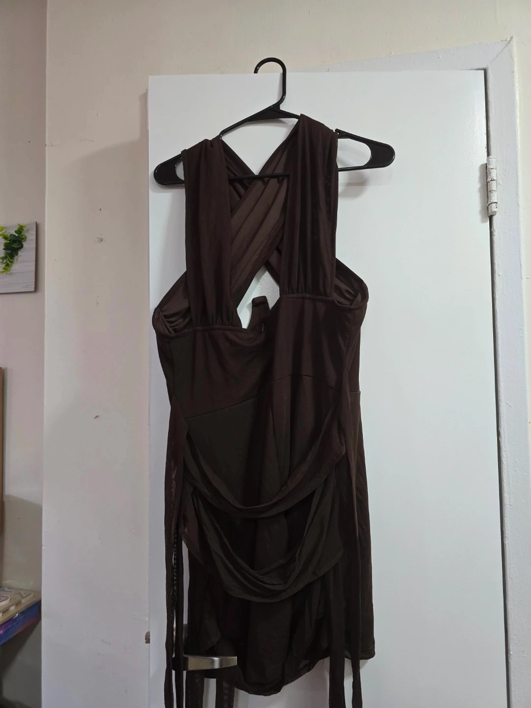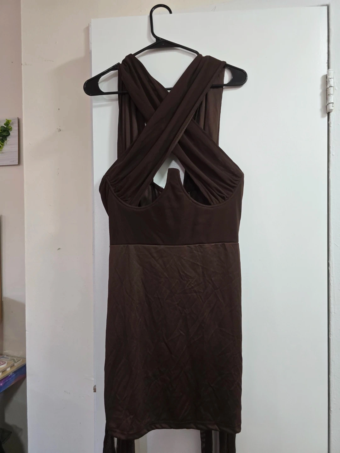 This is a PrettyLittleThing brown mini dress in a size 14. It features a unique criss-cross back design and is perfect for a night out or special occasion. The dress is in excellent condition!