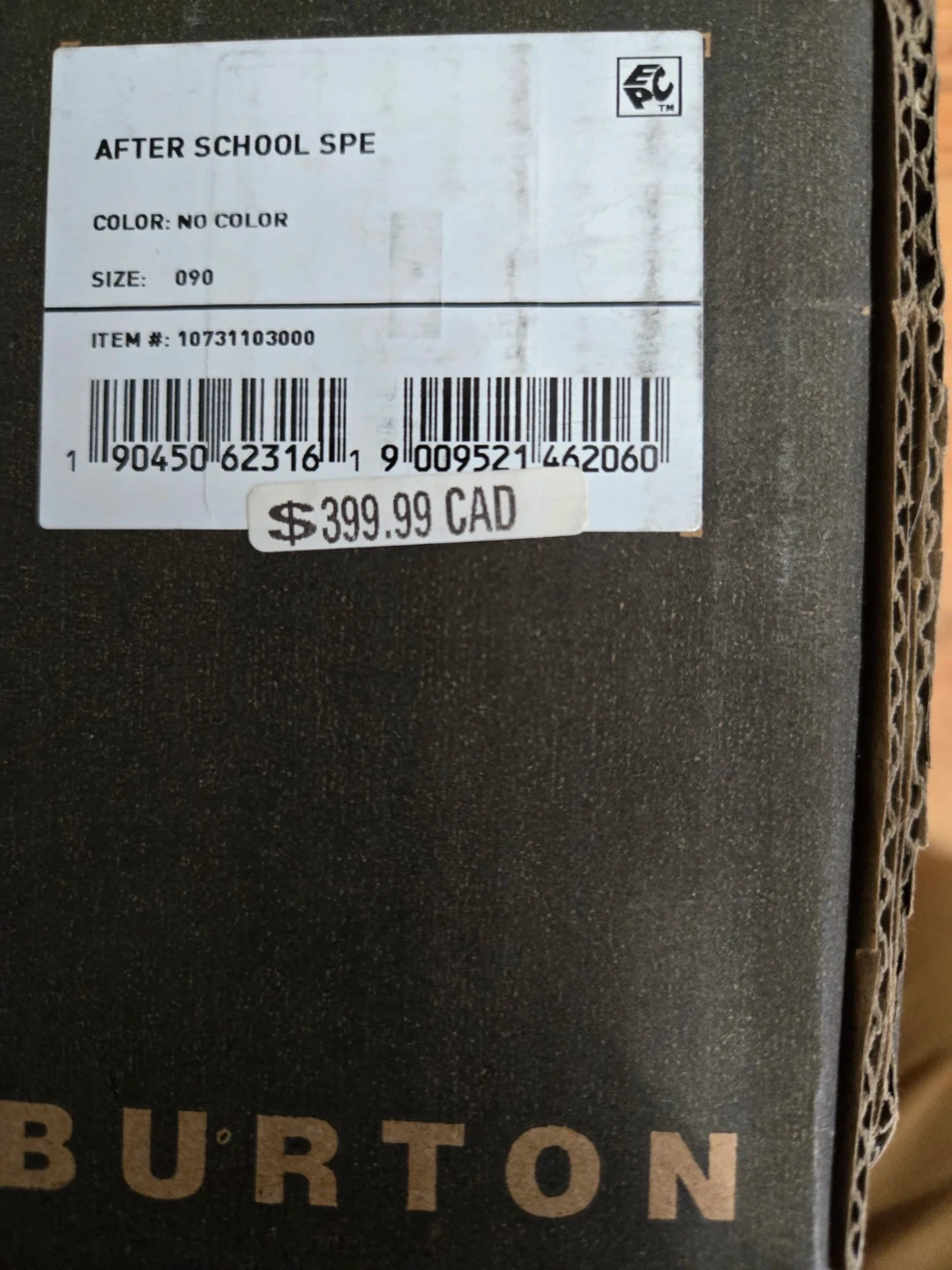 Selling a Burton After School Special snowboard and matching boots! The snowboard has a fun design and is ready for the slopes. The boots are size 090. They were 111$ brand new the snowboard Originally bought for $399.99 CAD. Comes with the original box. Helmet is basically brand new too and originally 323$ so selling the lot for 750$ obo
