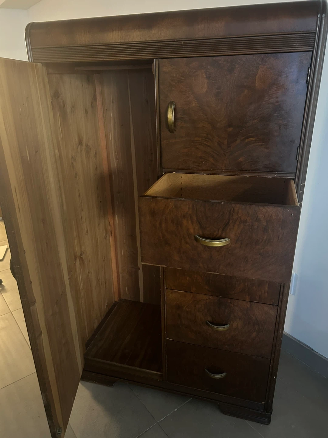 Selling a lovely Art Deco wooden armoire/ wardrobe. There is a closet door on one side with a shelf and very deep drawers on the other. The wood is walnut and has a beautiful warm tone. It definitely has some scratches and dings but it’s a very sturdy, functional piece of furniture.