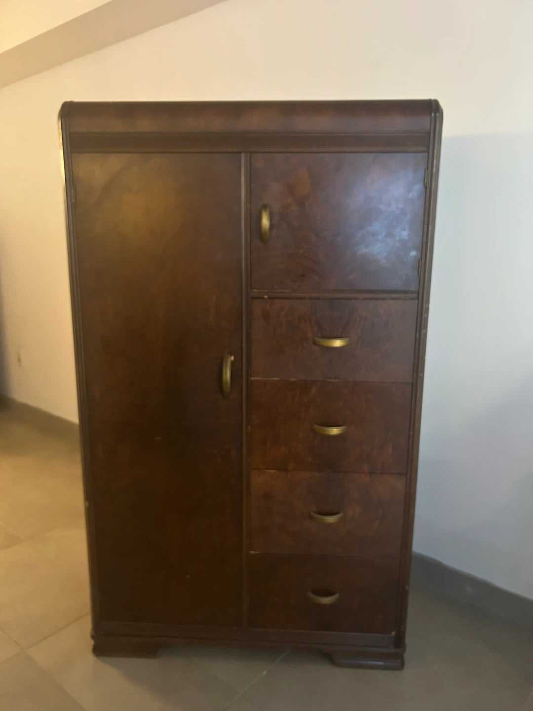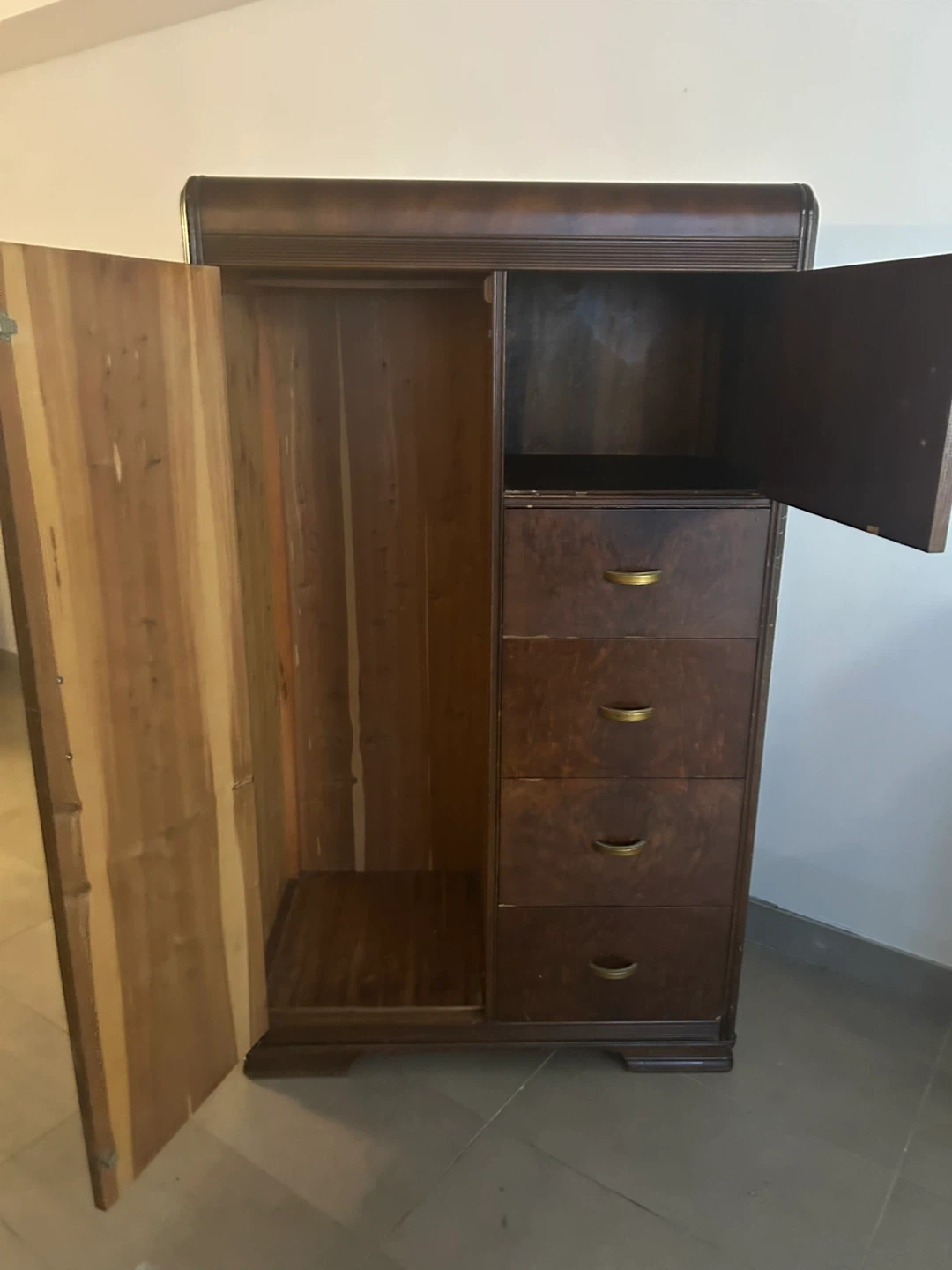 Selling a lovely Art Deco wooden armoire/ wardrobe. There is a closet door on one side with a shelf and very deep drawers on the other. The wood is walnut and has a beautiful warm tone. It definitely has some scratches and dings but it’s a very sturdy, functional piece of furniture.