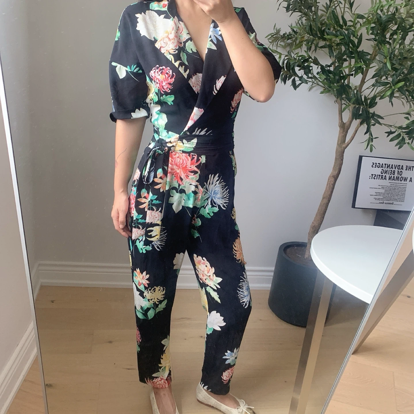 ZARA Black Floral Jumpsuit Size XS | Belted Waist