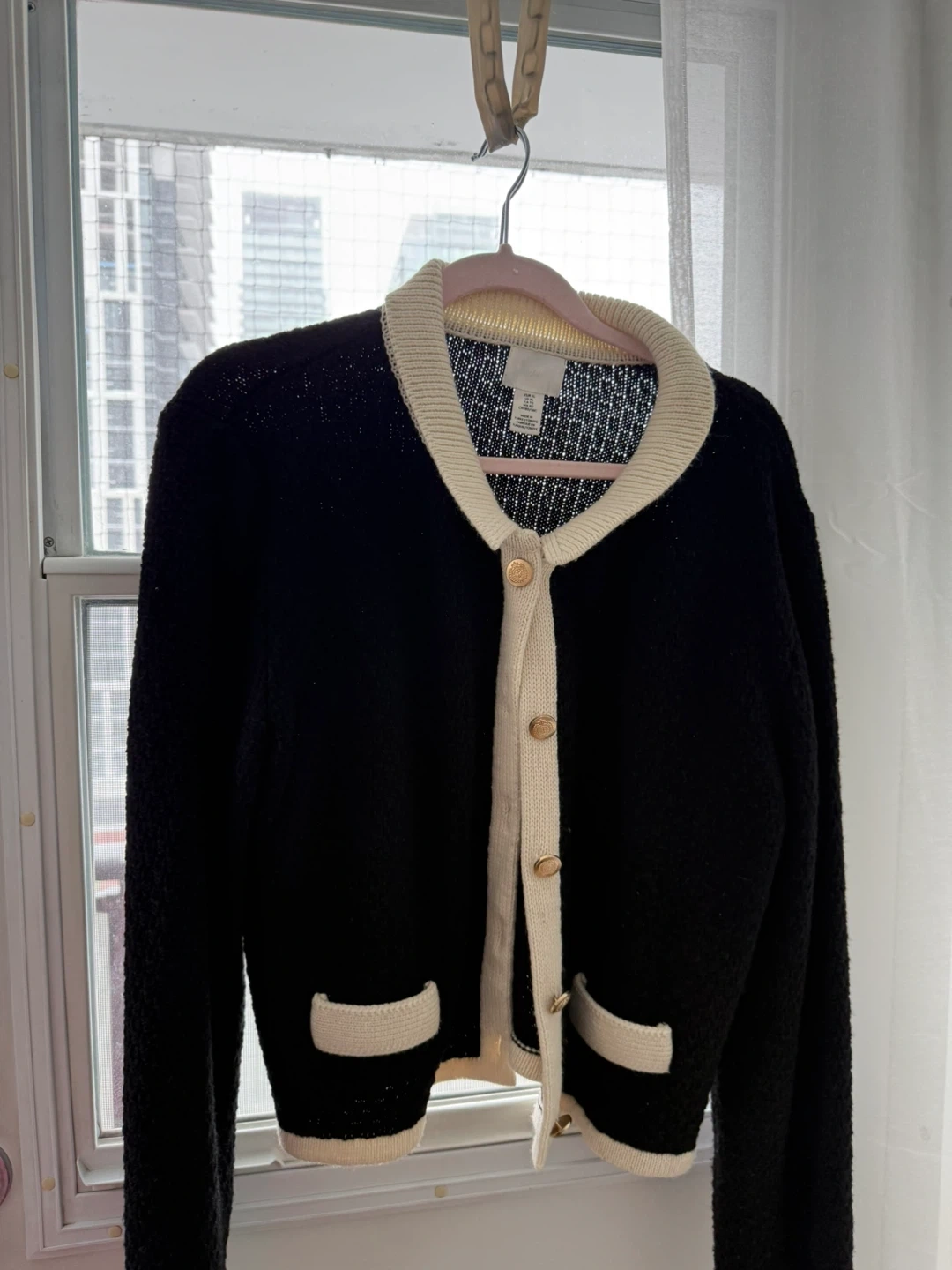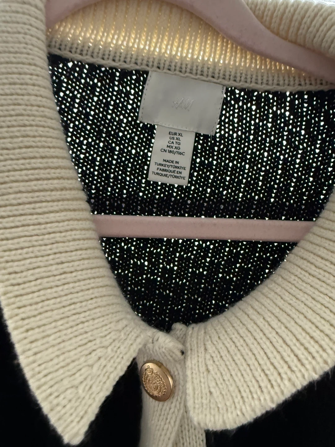 This is a cute H&M cardigan in size XL. It features a black knit body with cream-coloured collar and trim. The cardigan has gold-tone buttons and two small pockets at the front. It's in great condition and ready for a new home!