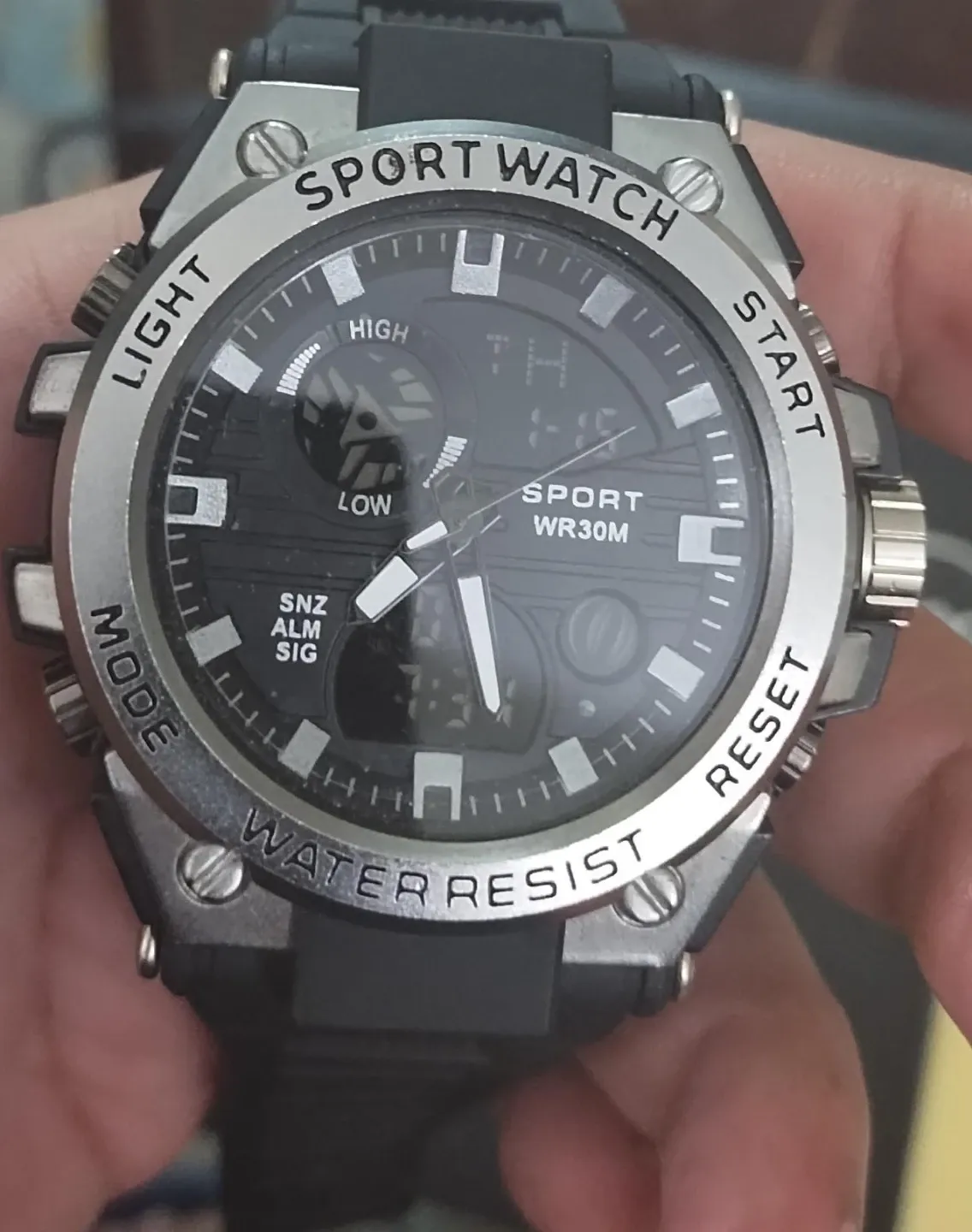 Selling a sport watch with a black band and silver-tone bezel. It features multiple functions including light, mode, start, and reset. The watch is water-resistant and has a sporty look!