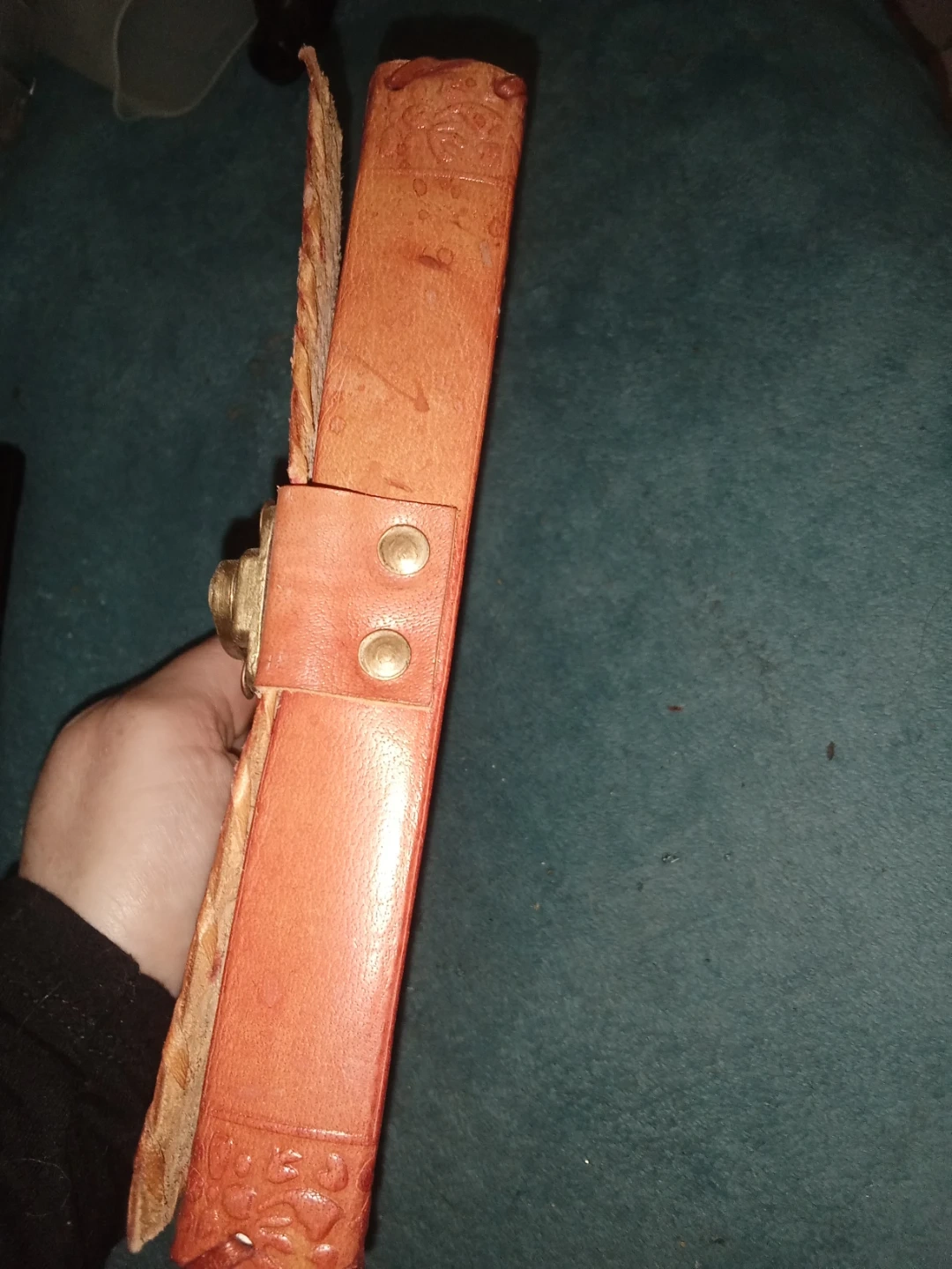 Selling a red leather journal diary. It has a unique design with a stone in the center and a metal clasp. The leather has an embossed floral pattern around the edges. Great for writing or sketching!