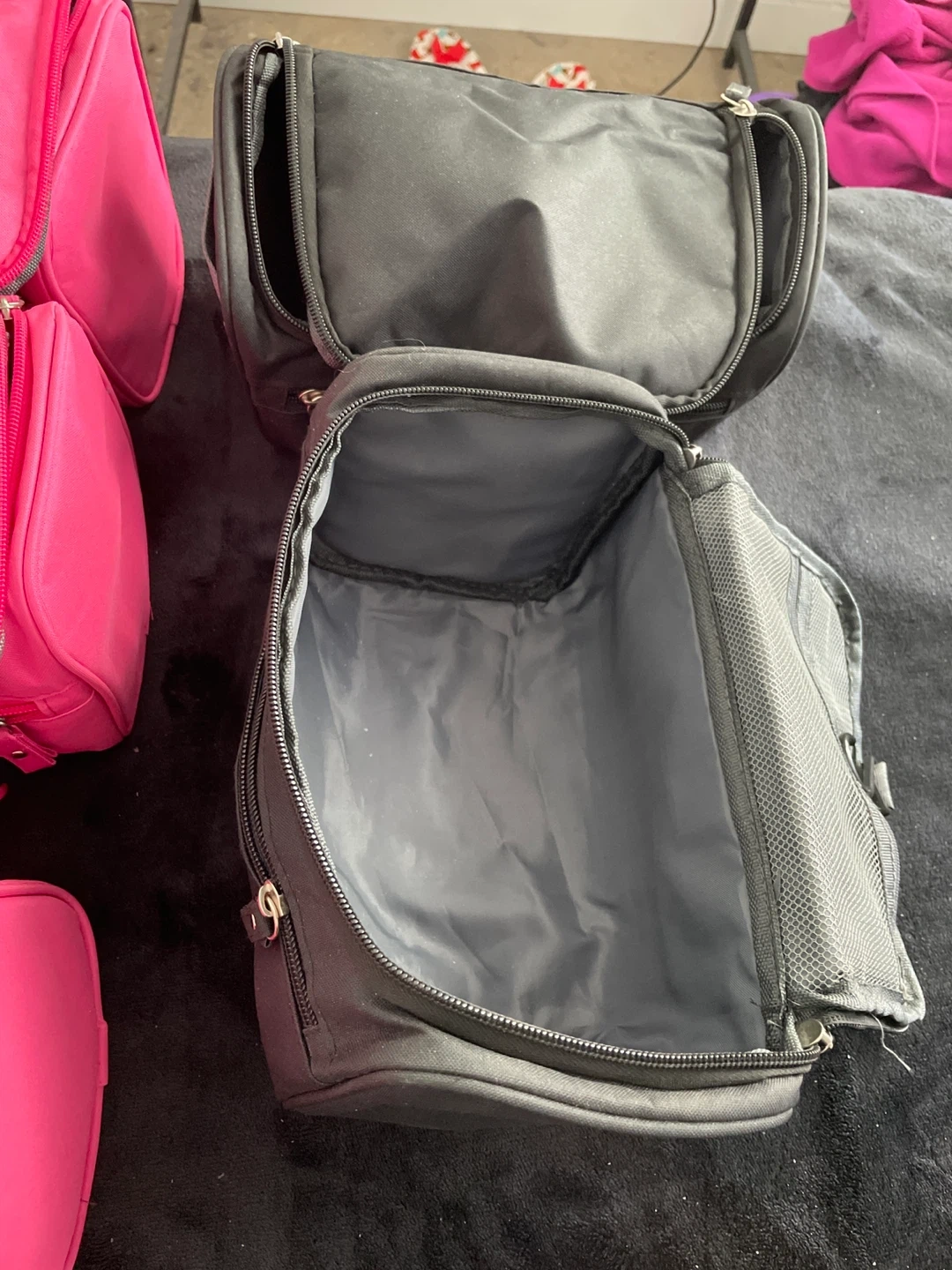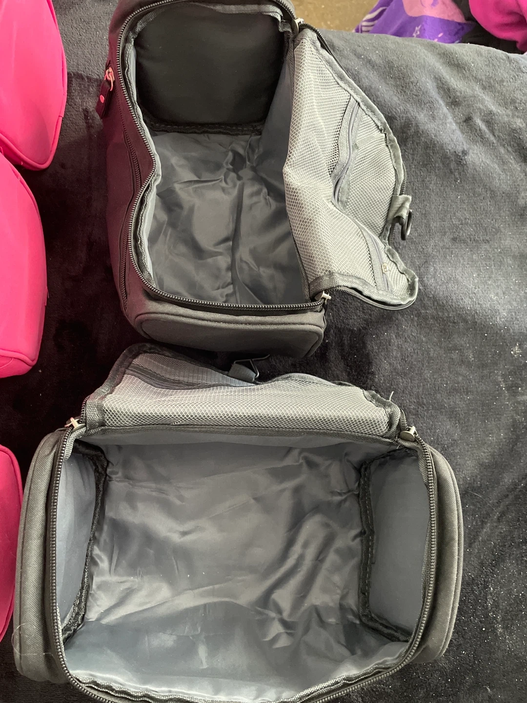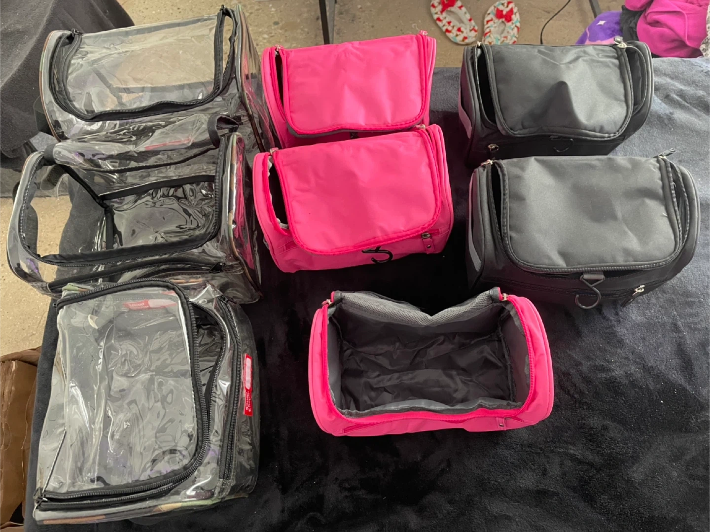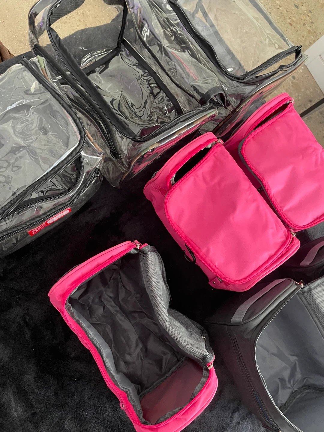 They are in the colors shown and both bags ( the pink & grey and the black & grey ) are the exact same size.