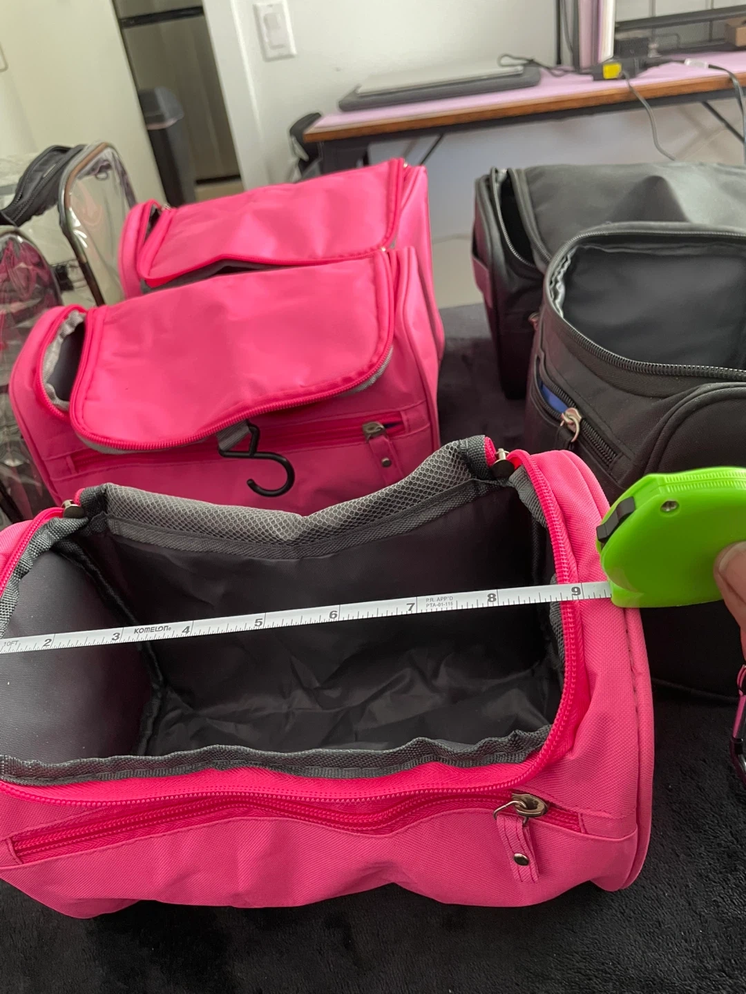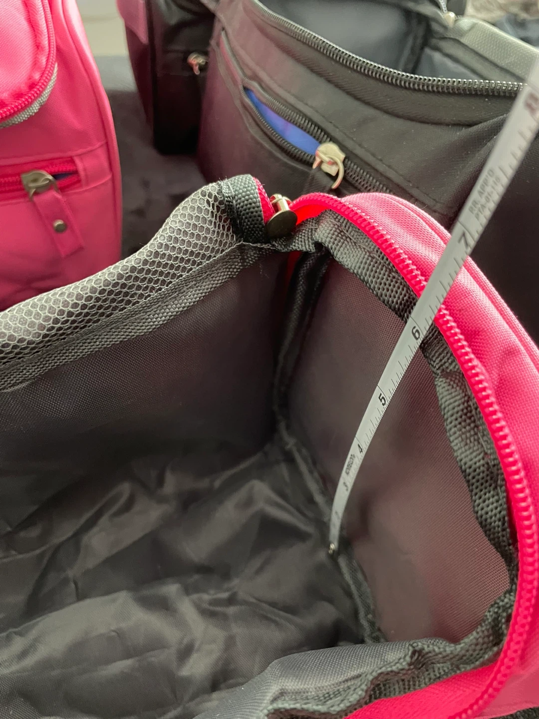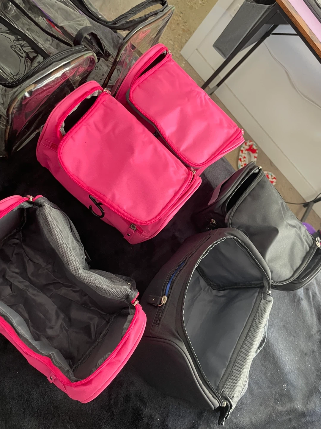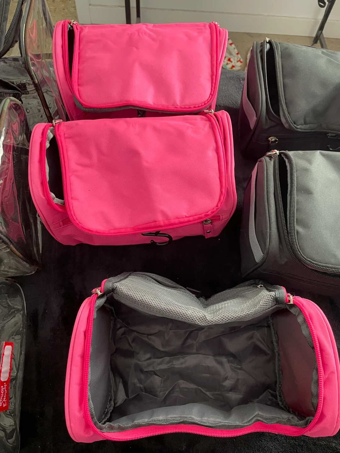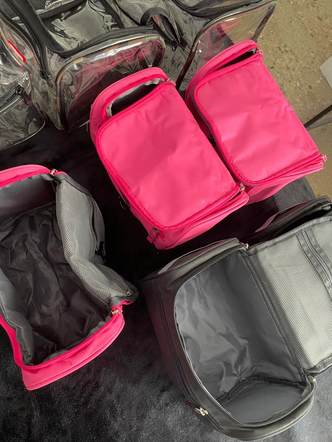 They are in the colors shown and both bags ( the pink & grey and the black & grey ) are the exact same size.