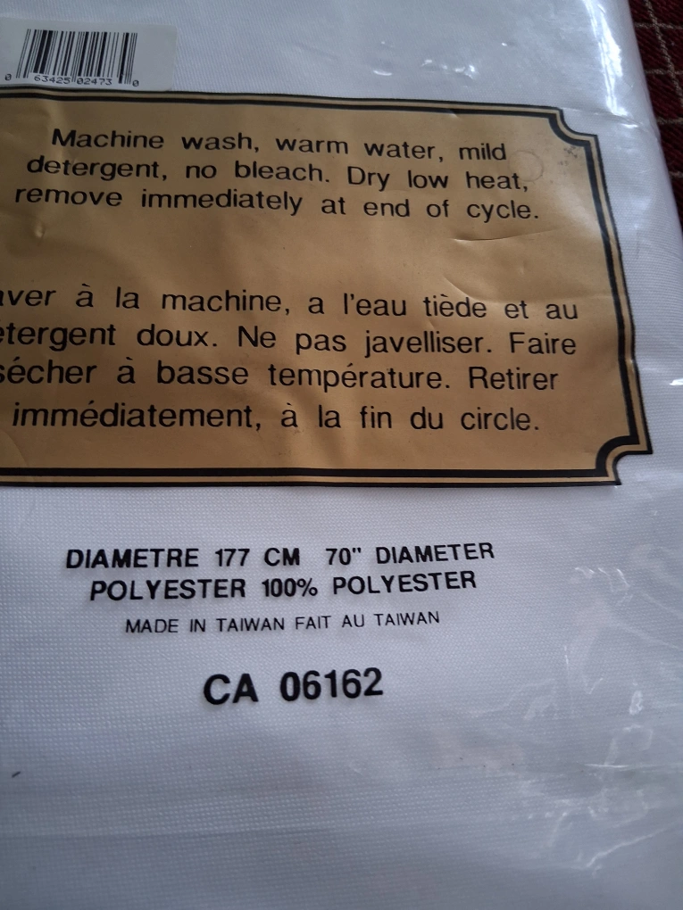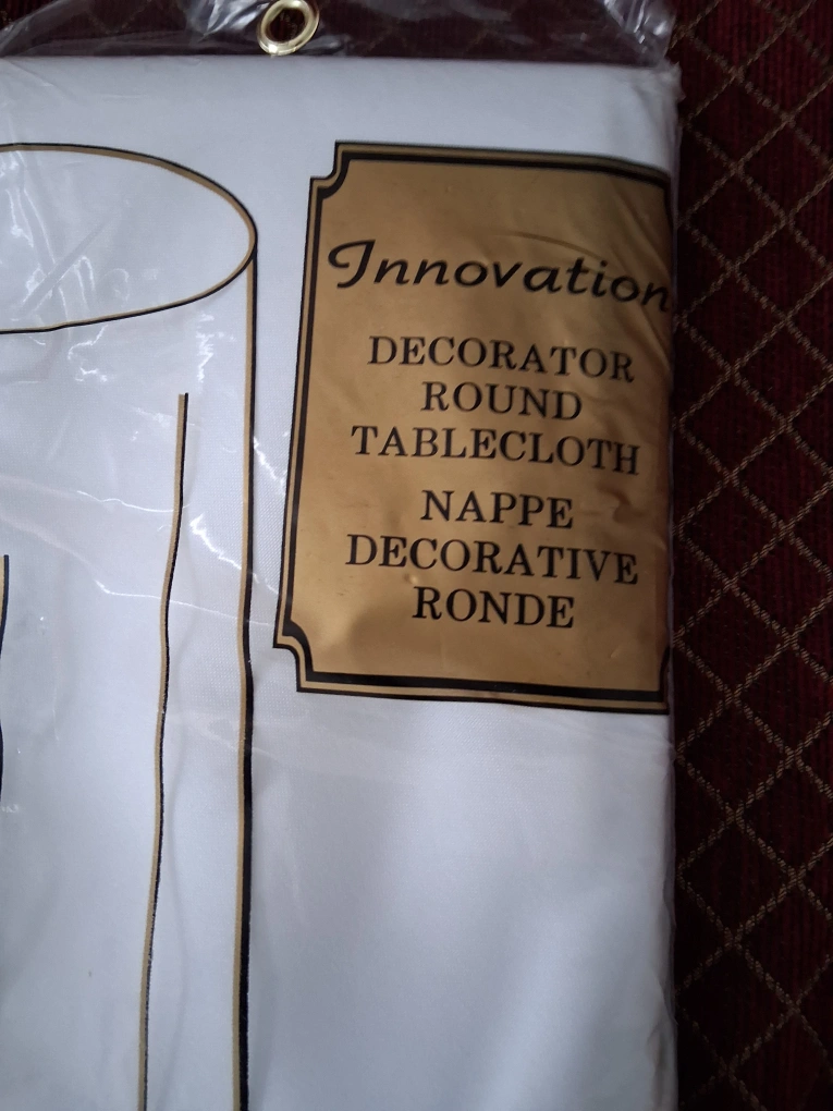Selling a new, still-in-packaging Innovation Decorator Round Tablecloth! It's a 70" diameter tablecloth made of 100% polyester. Machine washable for easy care!