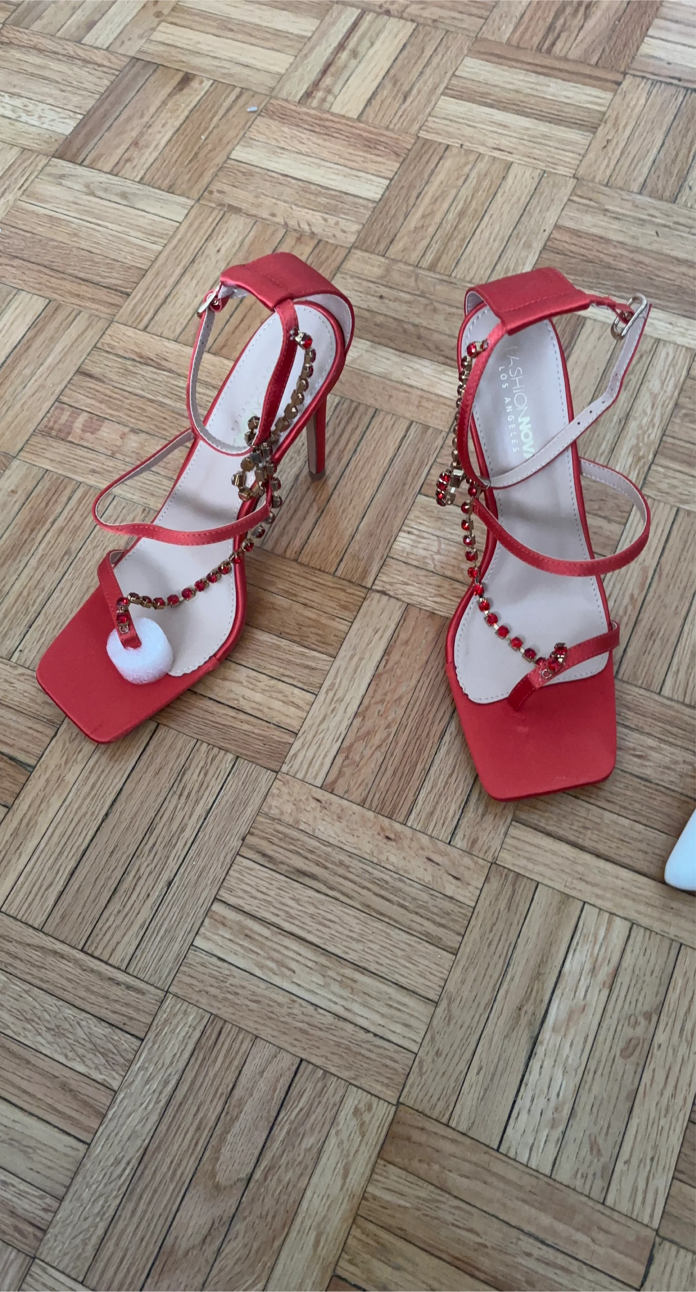 These are a pair of stylish red heels from Fashion Nova! They feature delicate straps and some cute beaded detailing. Perfect for dressing up any outfit!
