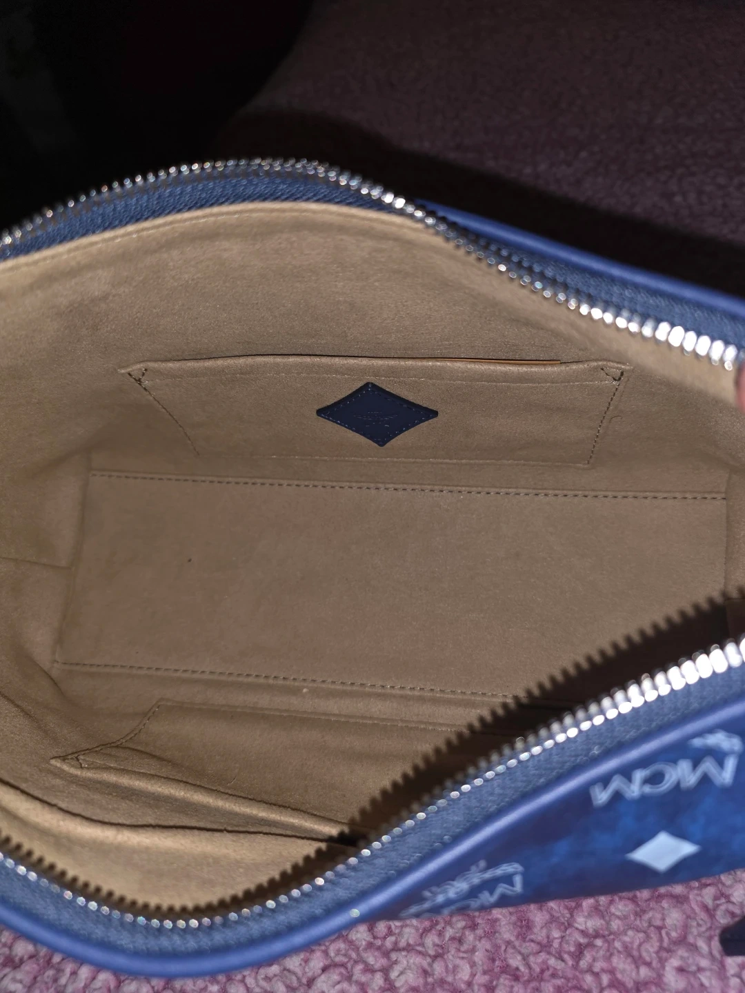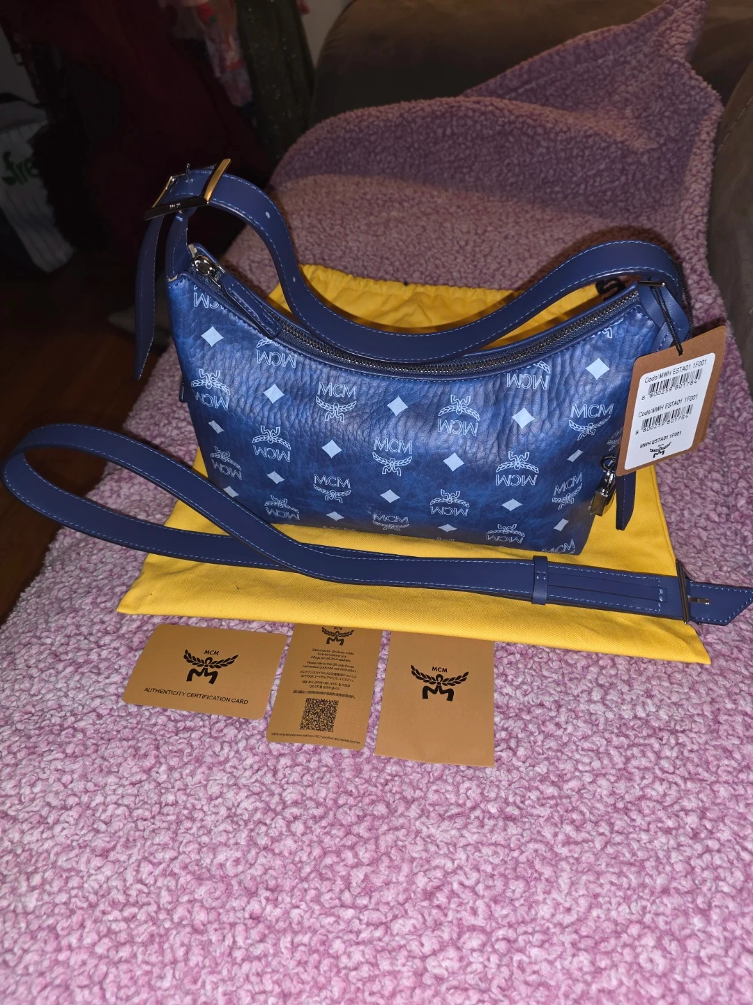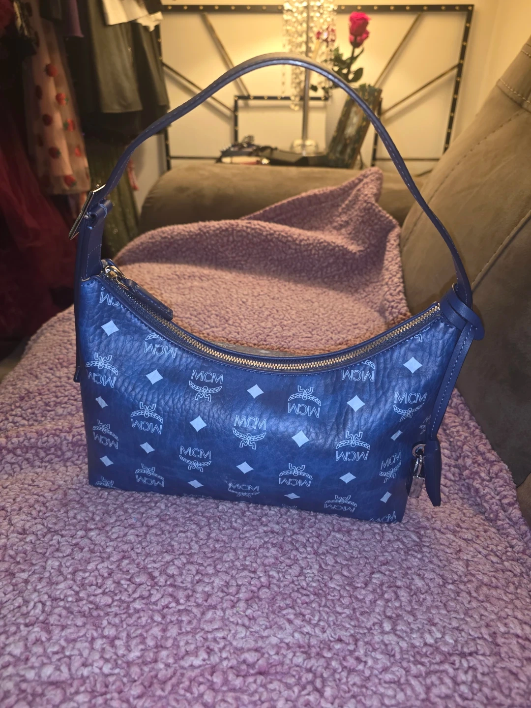 This MCM hobo shoulder bag is in excellent condition! The stylish blue bag features the MCM logo pattern. It comes with an authenticity certification card and a dust bag. Has a small white mark on one side, barely noticeable.