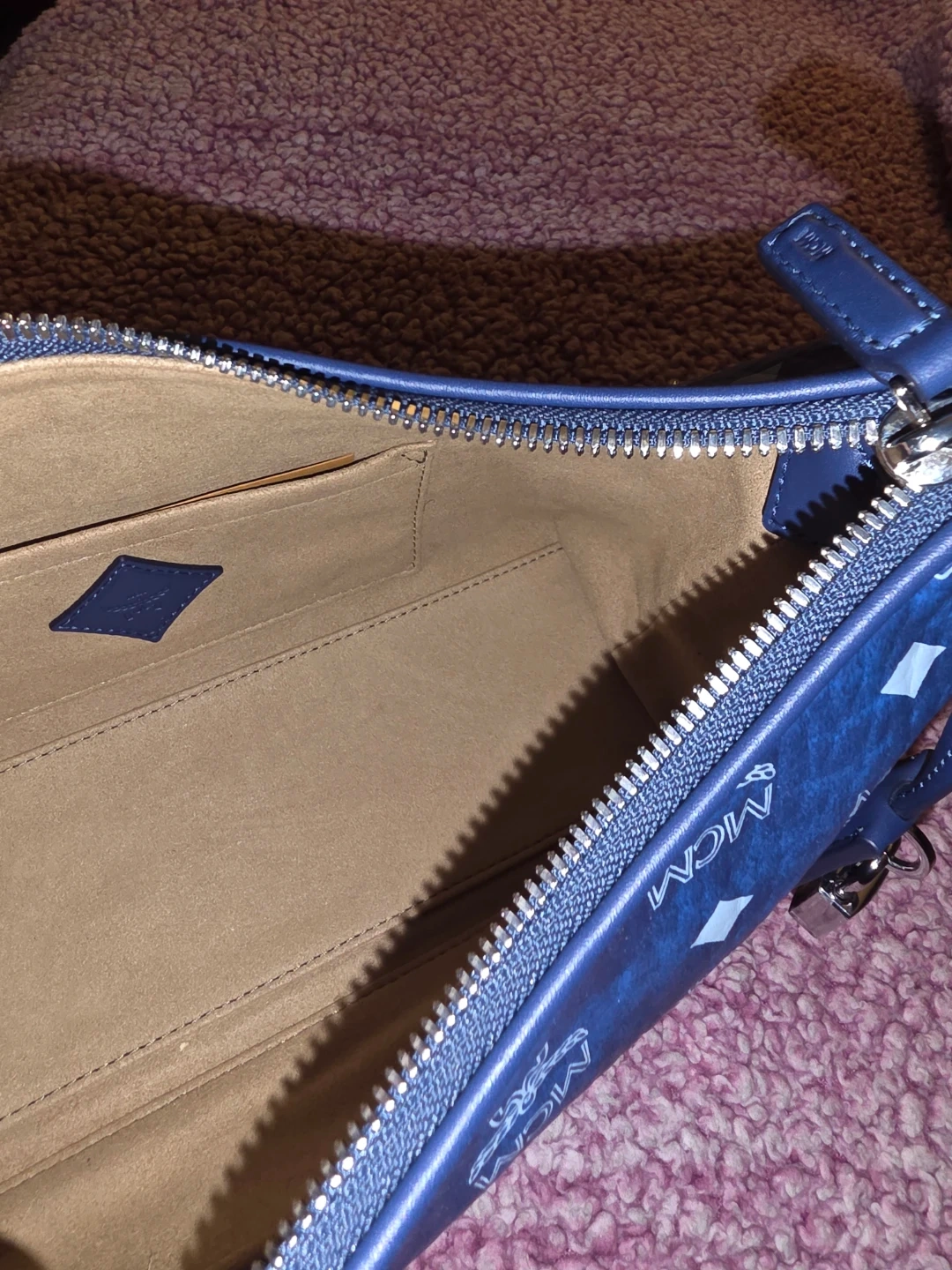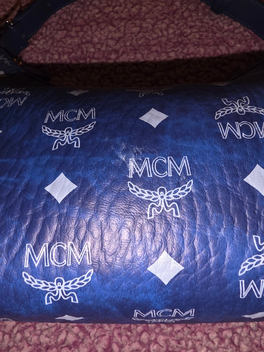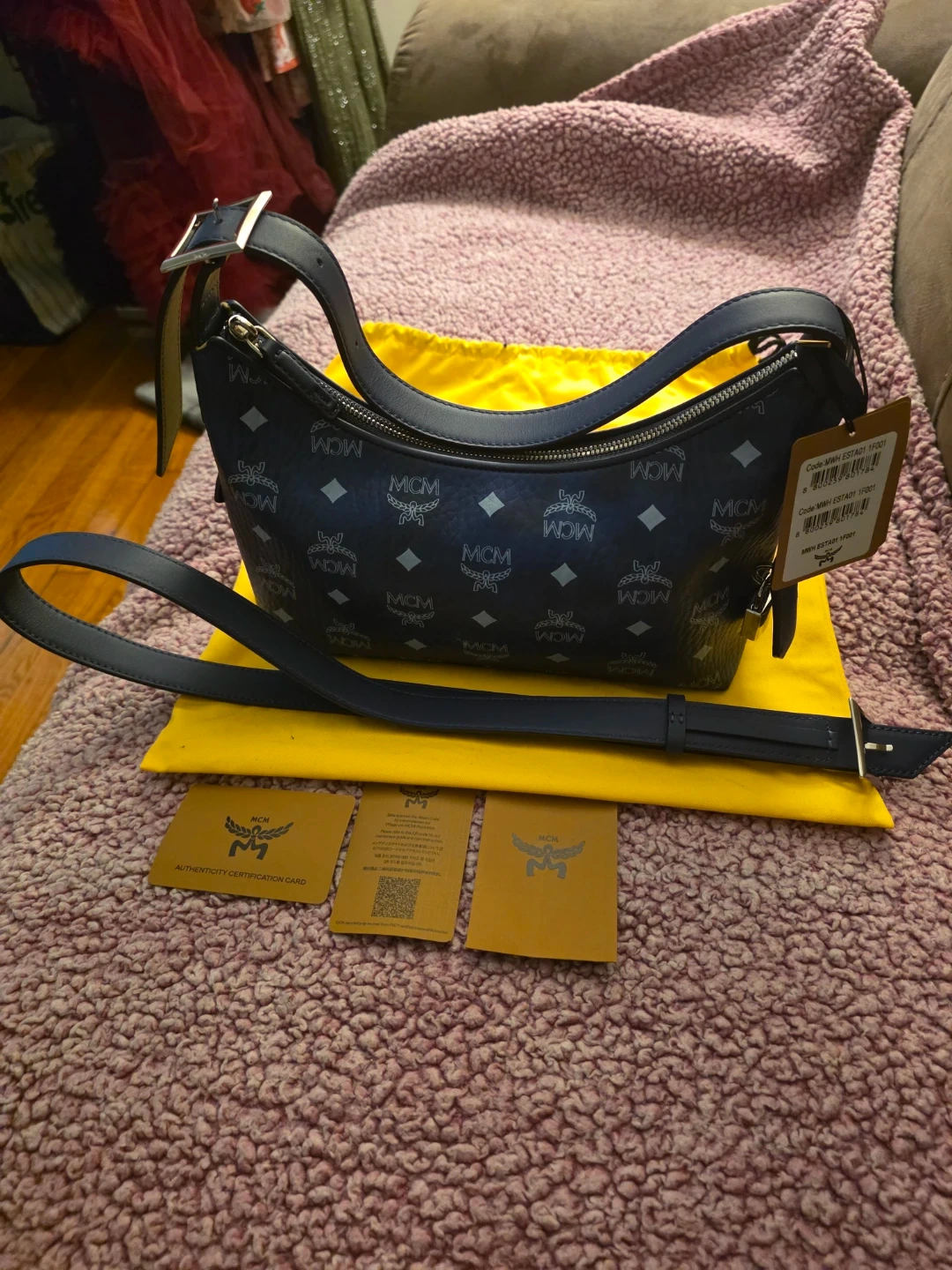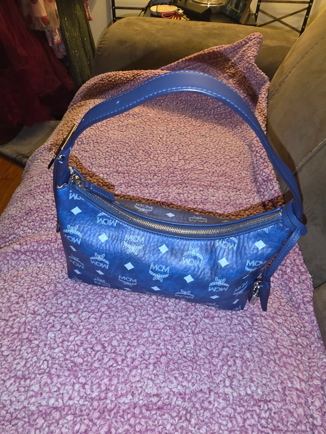 This MCM hobo shoulder bag is in excellent condition! The stylish blue bag features the MCM logo pattern. It comes with an authenticity certification card and a dust bag. Has a small white mark on one side, barely noticeable.