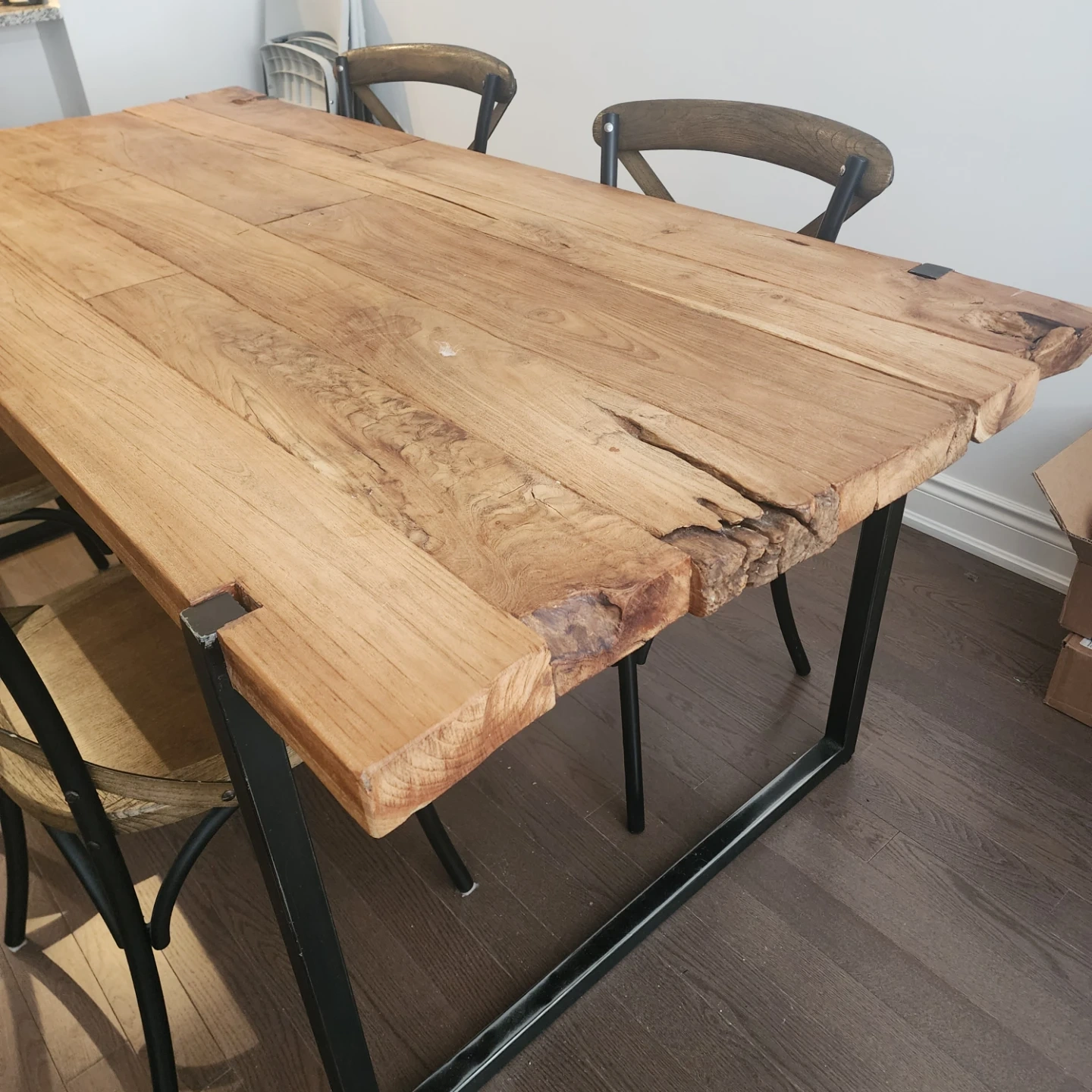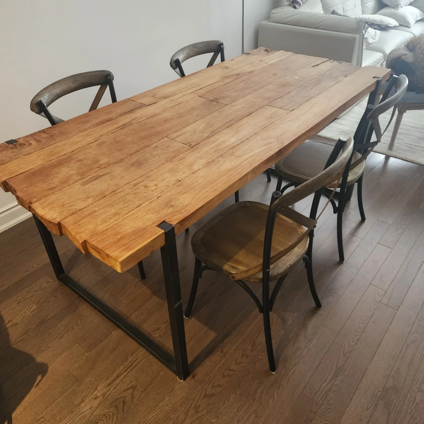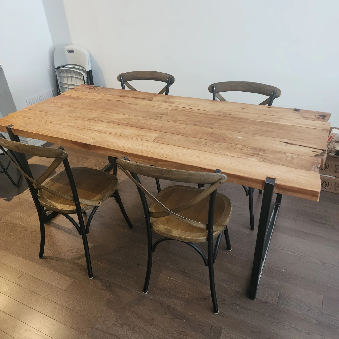 Selling a rustic dining table with four matching chairs! The table features a beautiful wood top with a unique, natural edge and sturdy black metal legs. The chairs have a classic cross-back design and complement the table perfectly. A great set to add some character to your dining space!