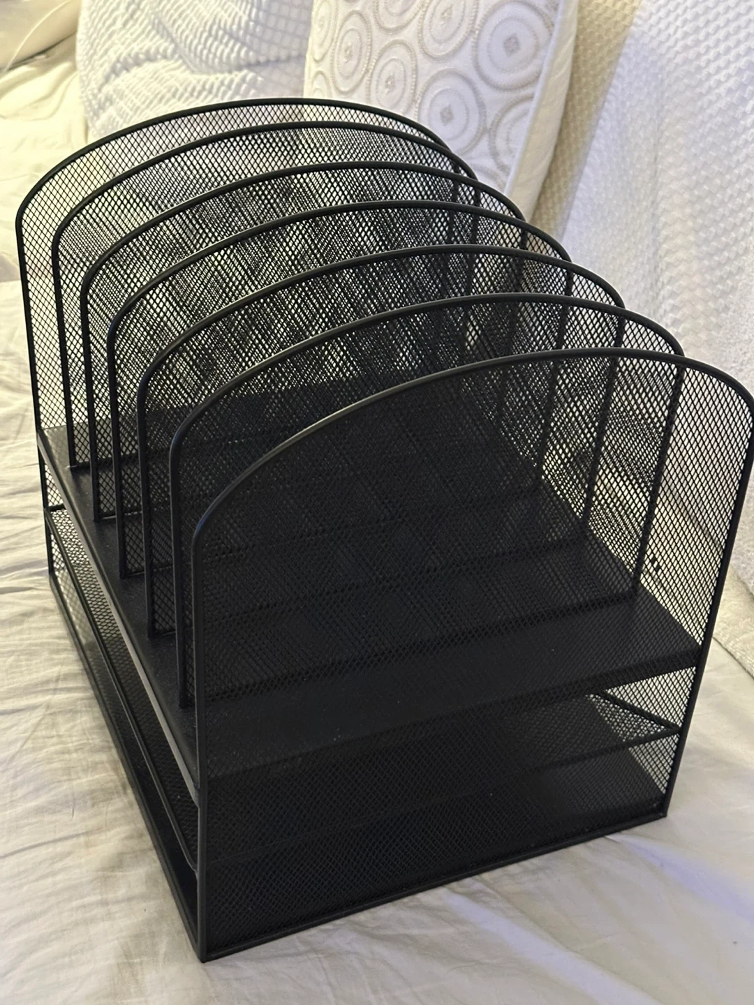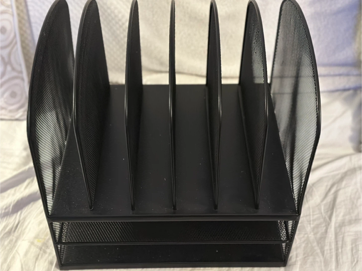 Here's a black mesh desk organizer, perfect for keeping your papers and files tidy! It's in great condition and ready to help you declutter your workspace. Very good condition and clean.