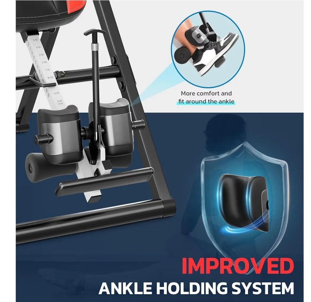 Get back pain relief with this YOLEO ITX360 Inversion Table! It's foldable, easy to move, and has a one-pin folding system for more space-saving convenience. It features a removable lumbar pad and reversible ankle holders. The table has a safety pin adjustable system, an easy height selector rod, and an adjustable headrest for comfort. It's made with a thickened alloy steel tube and can hold up to 300 lbs.