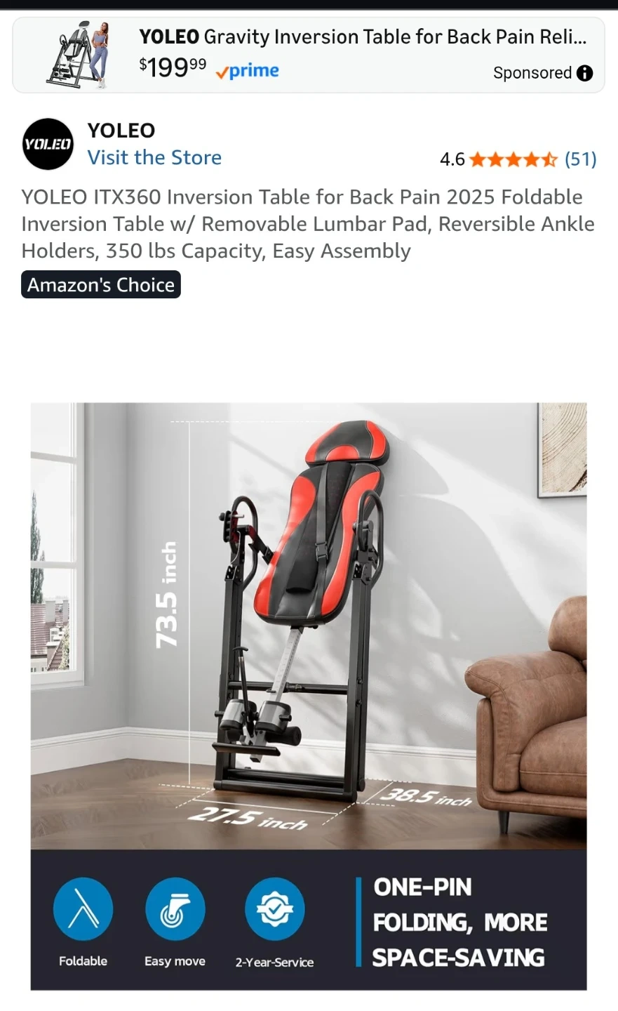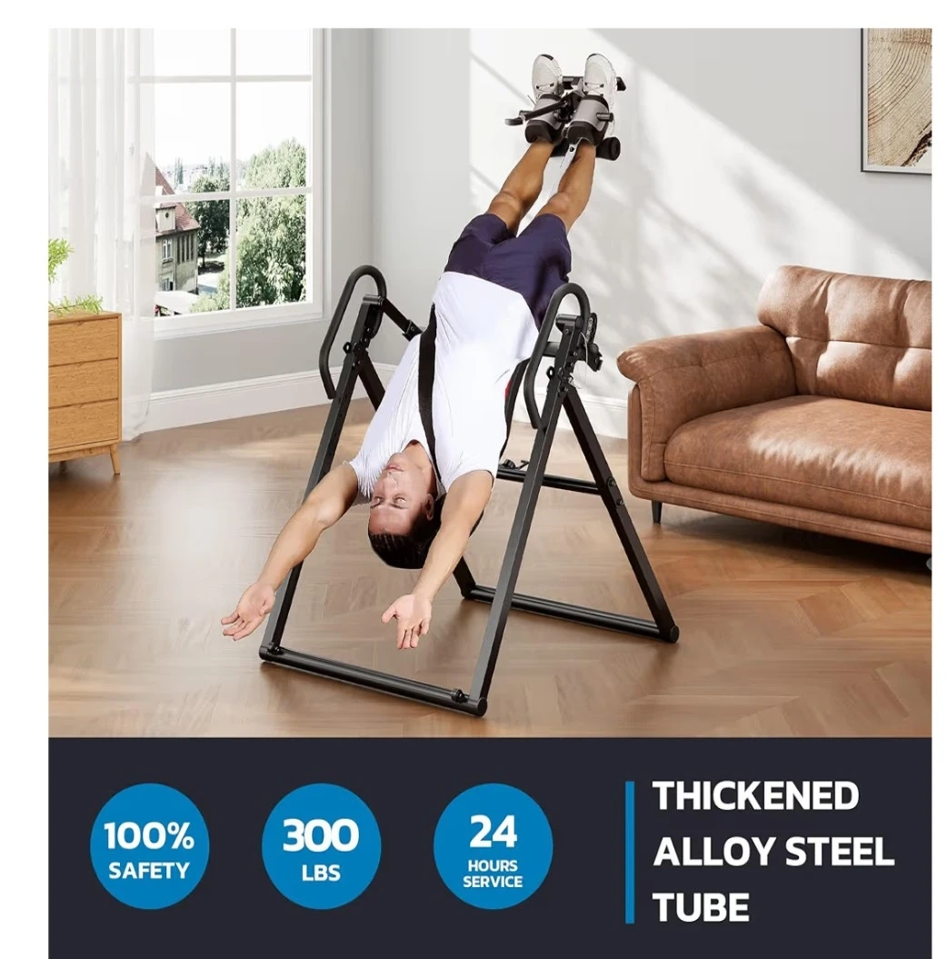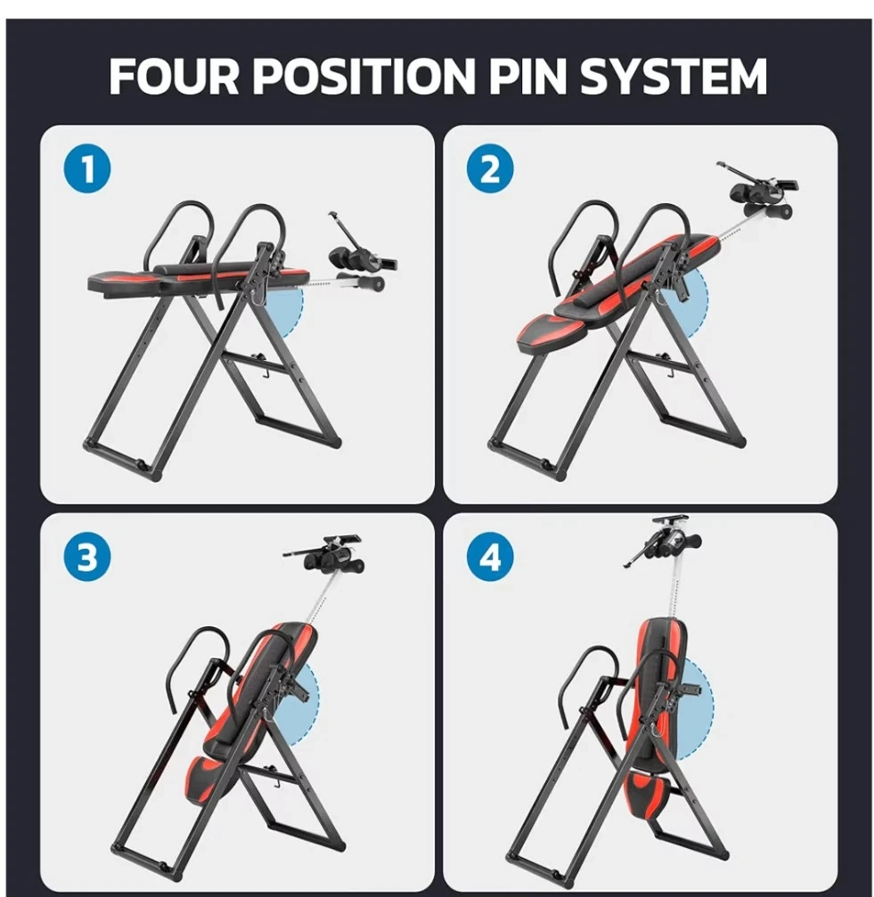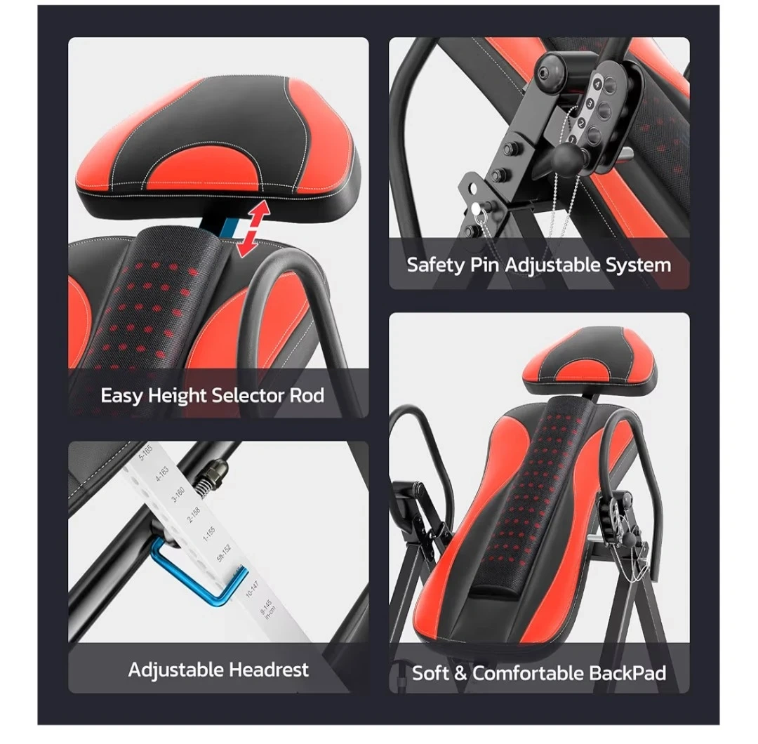 Get back pain relief with this YOLEO ITX360 Inversion Table! It's foldable, easy to move, and has a one-pin folding system for more space-saving convenience. It features a removable lumbar pad and reversible ankle holders. The table has a safety pin adjustable system, an easy height selector rod, and an adjustable headrest for comfort. It's made with a thickened alloy steel tube and can hold up to 300 lbs.