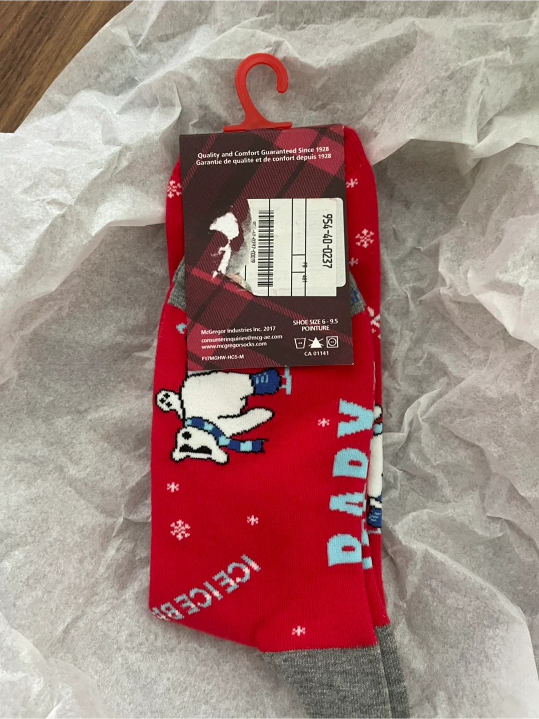 Cozy McGregor socks, perfect for keeping your feet warm! These are a size 6-9.5, and feature a fun "Ice Baby" design with polar bears on a red background