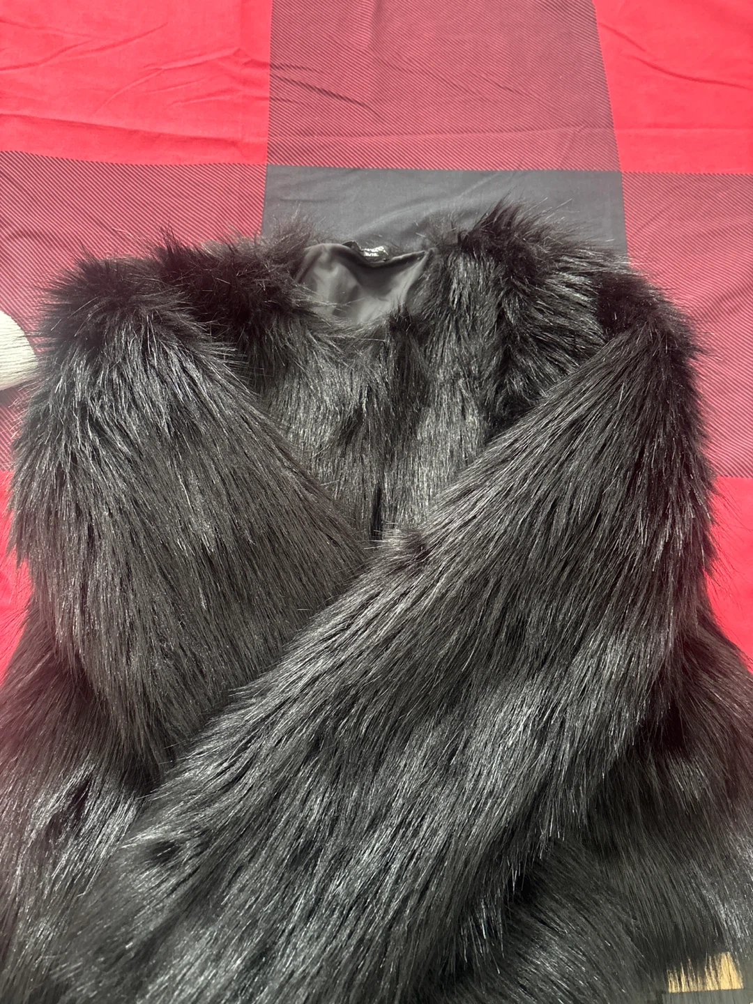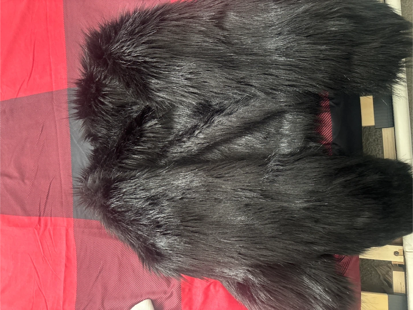 Here's a stylish faux fur coat in black! It's in great condition and perfect for adding a touch of glamour to any outfit