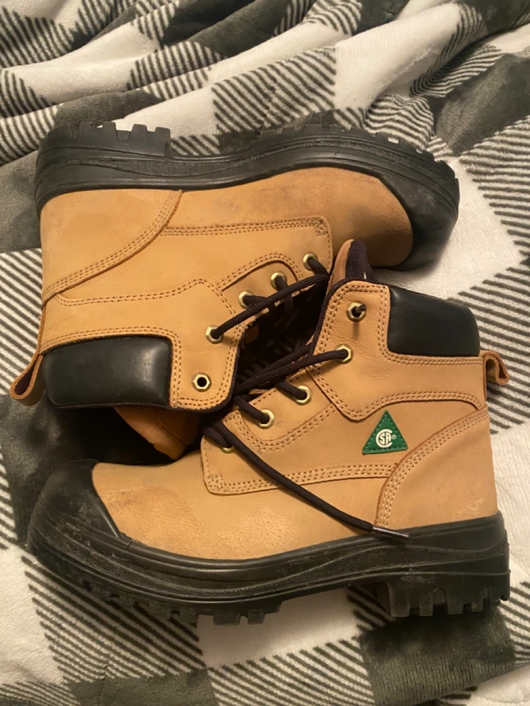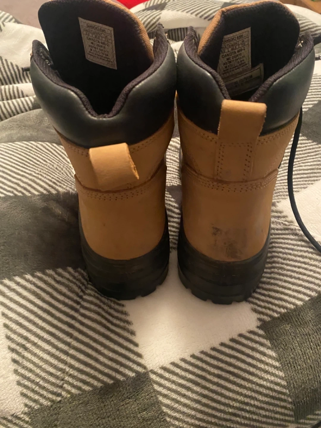 Selling a pair of Dakota Aggressor 400-2 work boots in size 8. They have a tan colour with black accents. These boots are in used condition, perfect for someone needing reliable footwear for work