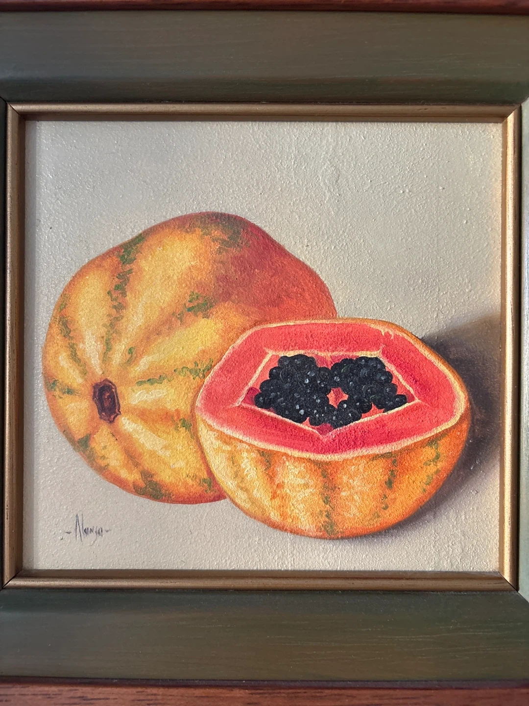 Beautiful hand-painted still life artwork featuring a tropical fruit, painted with warm tones and fine detail. The piece has a classic and timeless style that works well in kitchens, dining areas, or living spaces. • Hand-painted artwork (not a print) • Still life composition • Wooden frame in excellent condition • Artwork and frame are both in very good condition A tasteful decorative piece that adds warmth and character to any space.