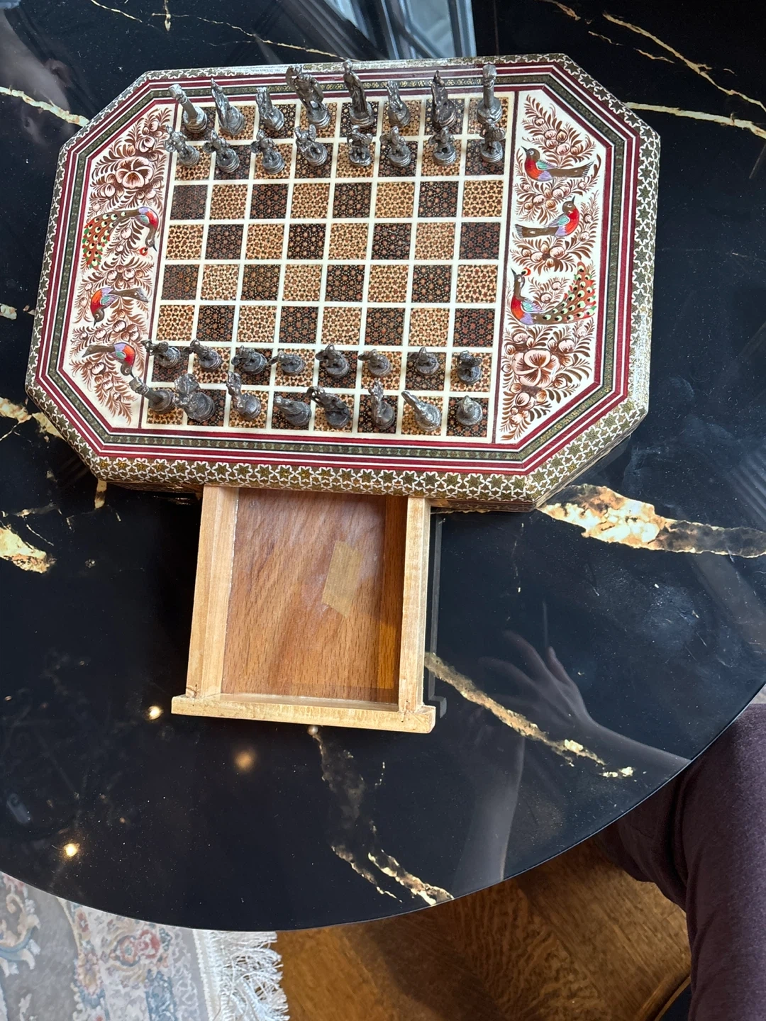Selling a unique decorative chess set! It features a beautifully designed board with an integrated drawer for storing the chess pieces. A great addition to any collection or a stylish piece for your home