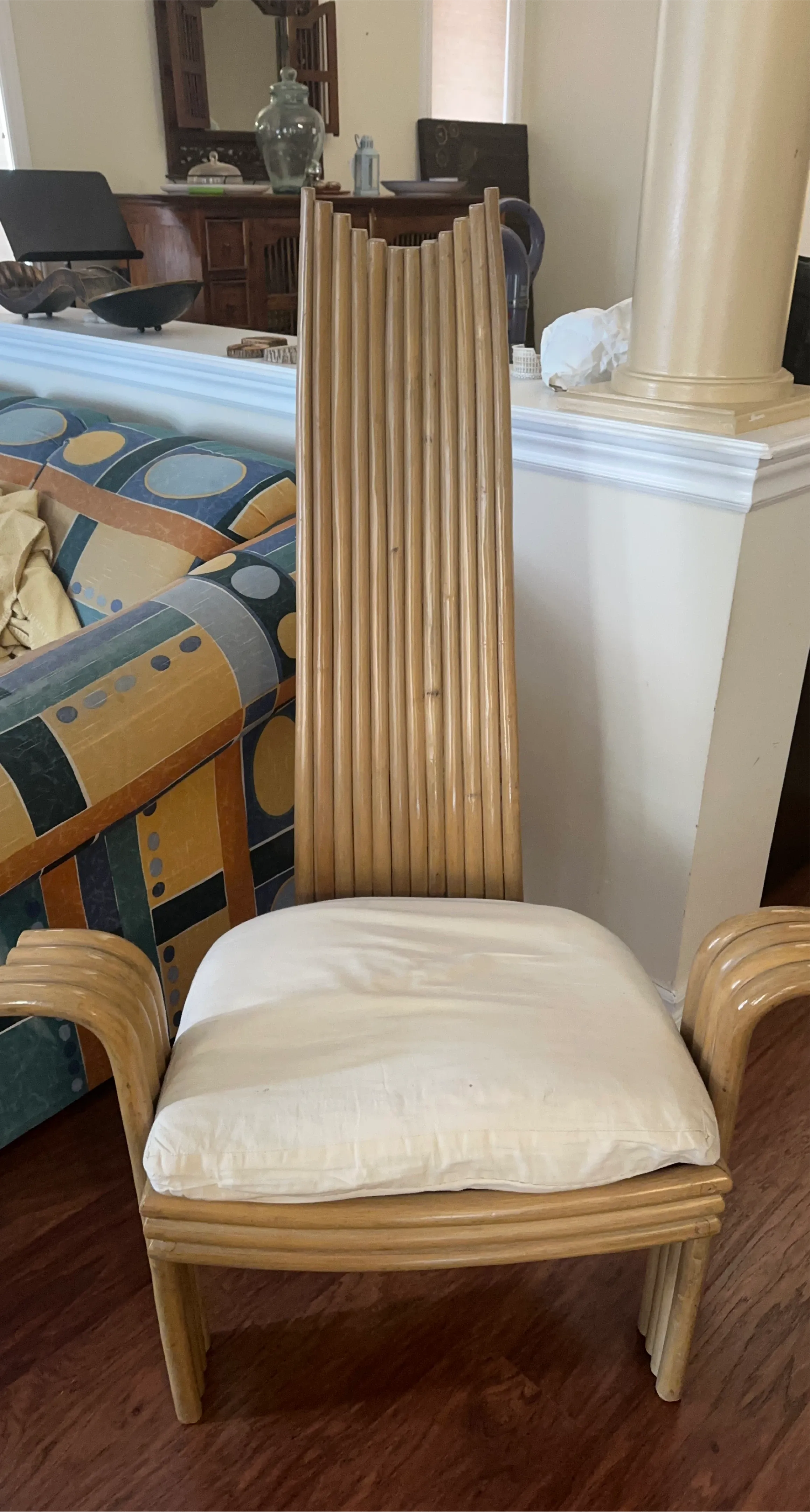 Selling a unique vintage bamboo chair! It features a high back made of bamboo stalks and a comfortable white cushion. Perfect for adding a touch of natural elegance to any room