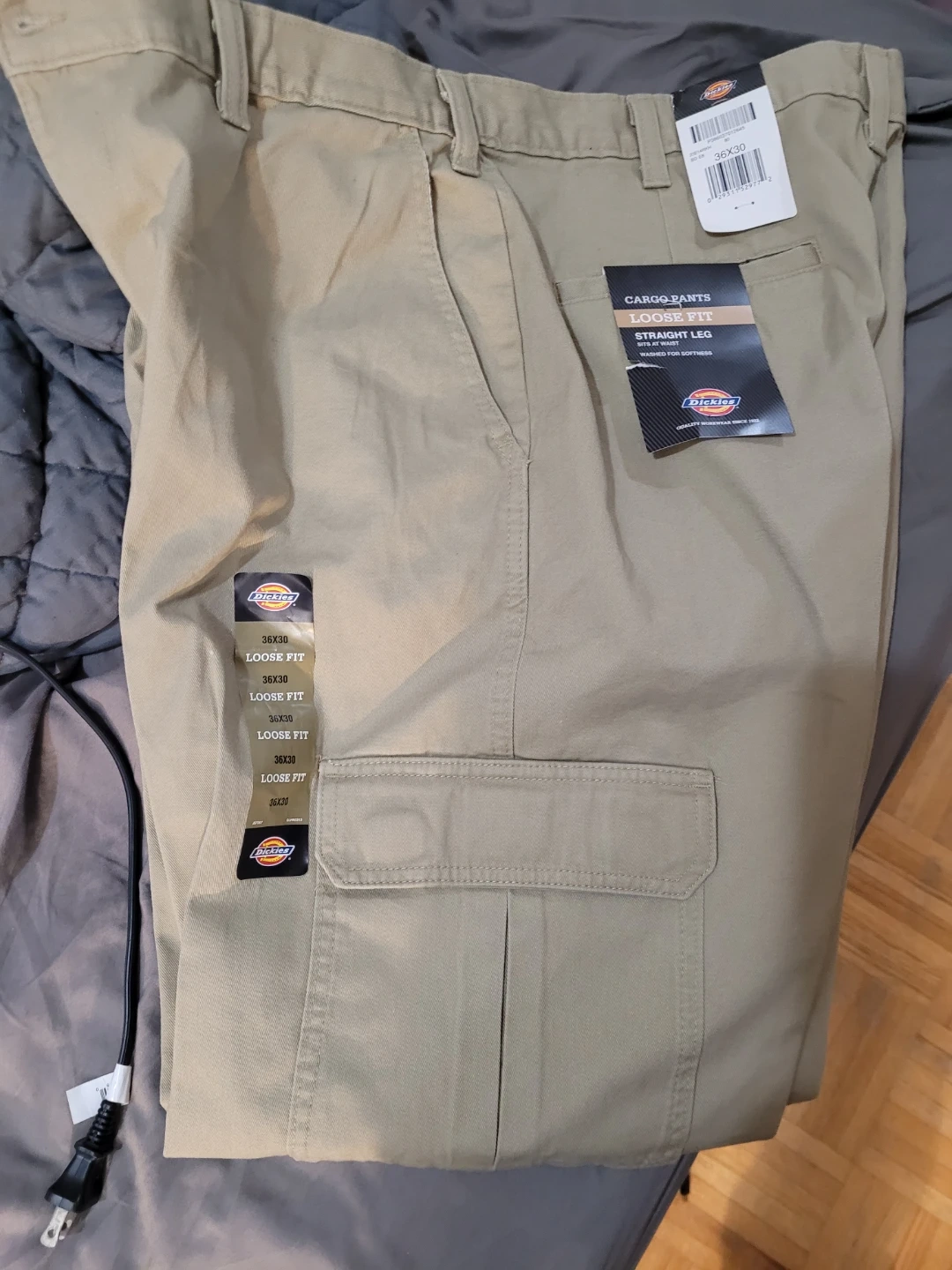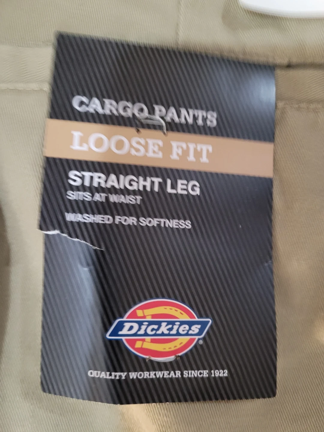 I'm selling a new pair of Dickies cargo pants. They are size 36x30 with a loose fit and straight leg. These pants sit at the waist and are washed for softness. Quality workwear since 1922