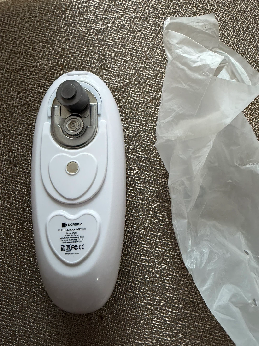 I'm selling a Koreksr electric can opener. It's in great condition and ready to use! It has a compact design and is easy to operate. It's white and runs on batteries.