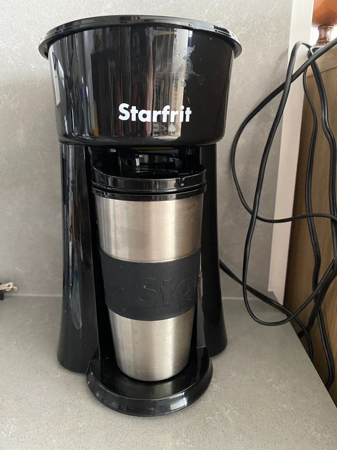 I'm selling a Starfrit coffee maker that comes with a travel mug. It's in great condition and perfect for brewing a single cup on the go. The coffee maker is black and compact, making it ideal for small spaces. It's super easy to use and clean!