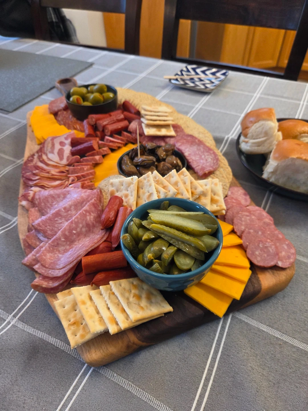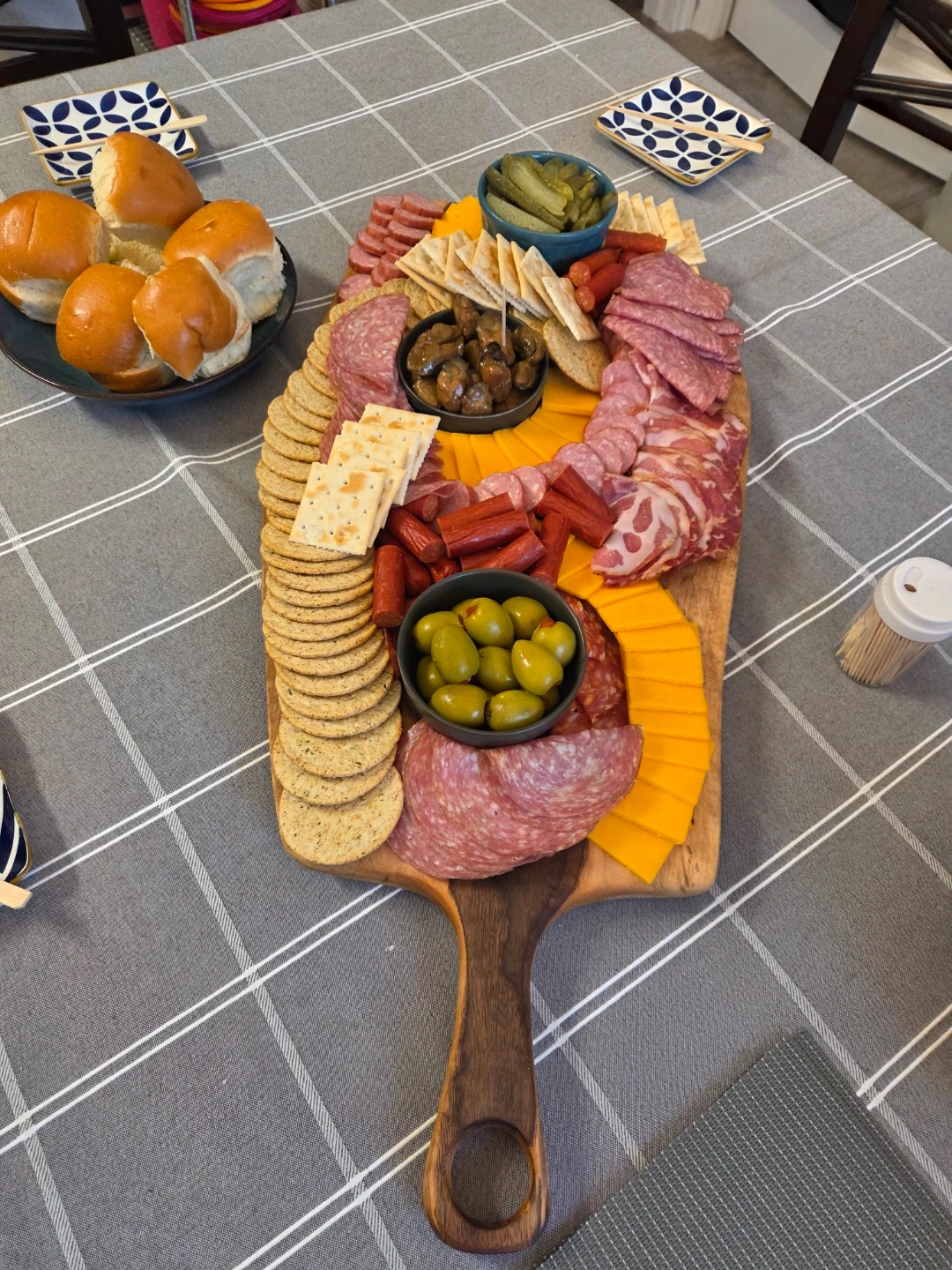 Selling a lovely wooden charcuterie board with a handle! It's perfect for serving appetizers, cheeses, or snacks for your next gathering. The board has a beautiful natural wood grain and a convenient handle for easy carrying and serving