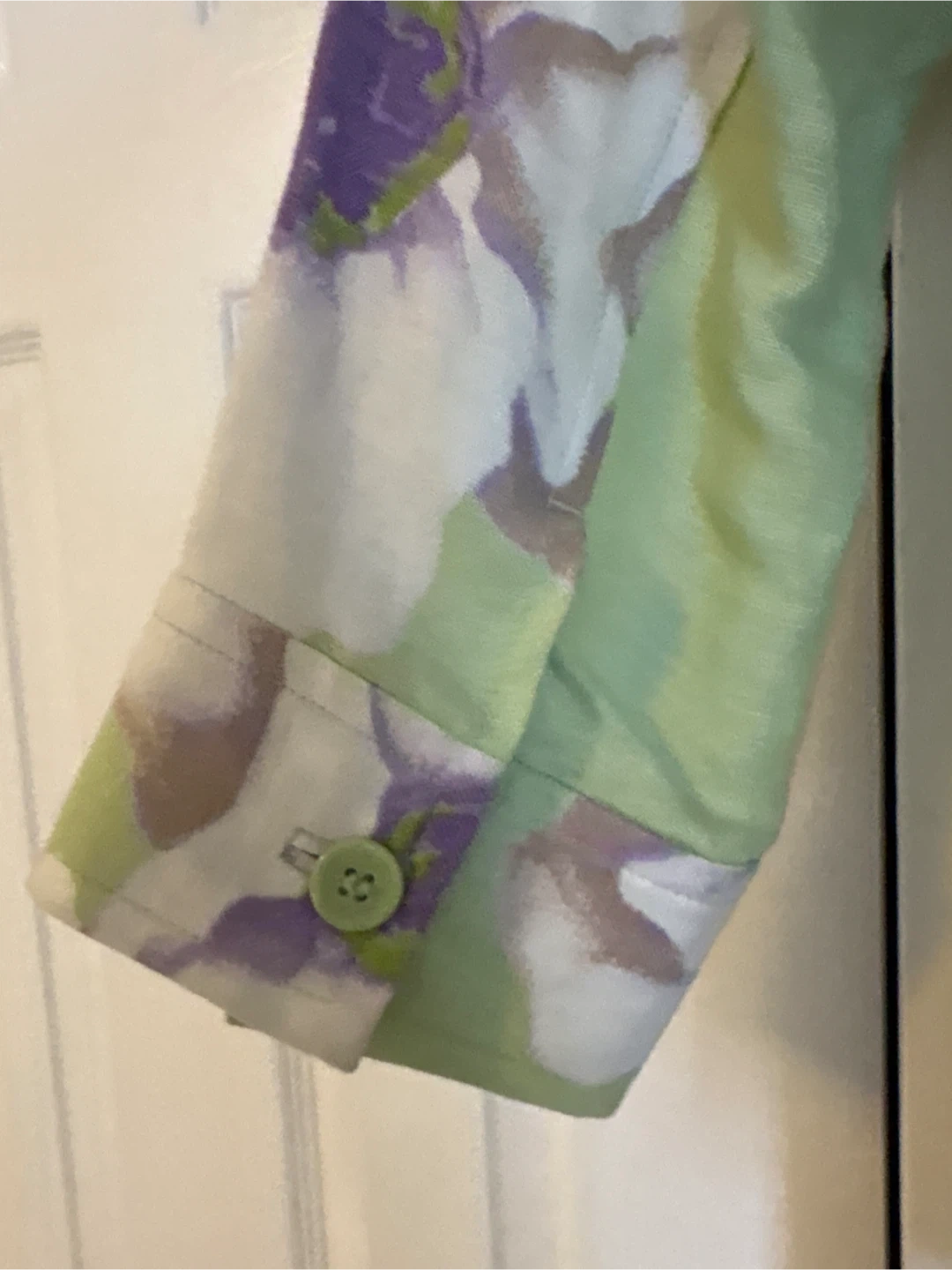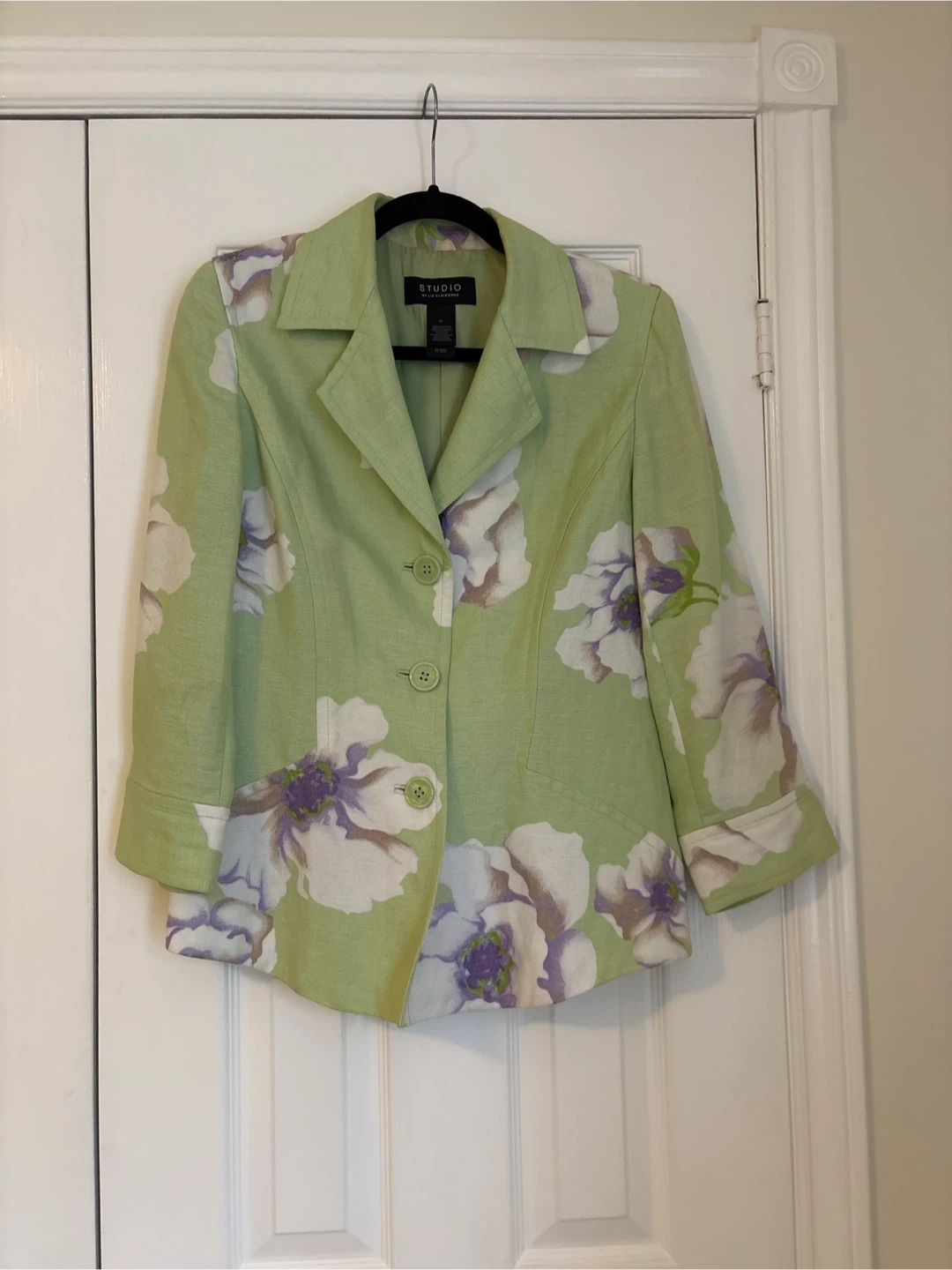 Selling a lovely Studio by Liz Claiborne blazer in size 10! It features a beautiful floral pattern on a light green background. The fabric is a blend of 52% linen and 48% rayon, making it comfortable and breathable. The lining is 100% acetate. A stylish addition to any wardrobe!