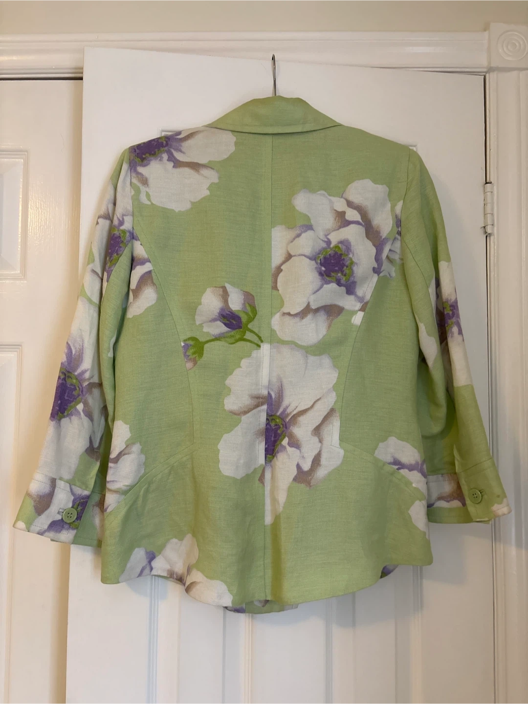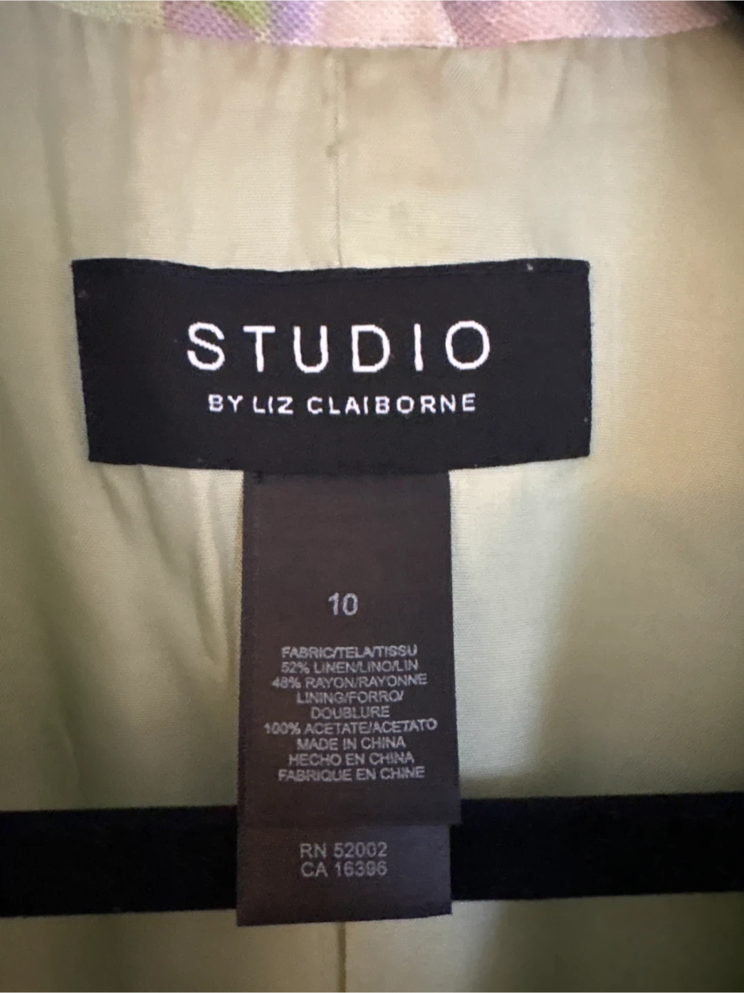Selling a lovely Studio by Liz Claiborne blazer in size 10! It features a beautiful floral pattern on a light green background. The fabric is a blend of 52% linen and 48% rayon, making it comfortable and breathable. The lining is 100% acetate. A stylish addition to any wardrobe!