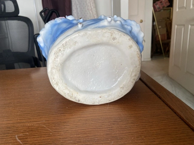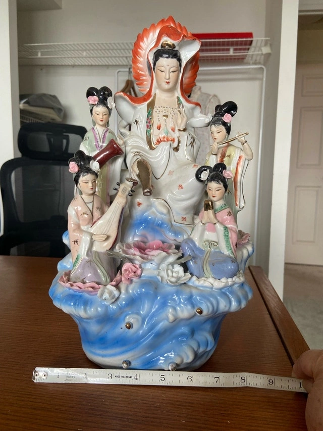 This striking Quan Yin statue features intricate detailing and vibrant colours, depicting the goddess surrounded by attendant figures amidst swirling waves. It's a pre-owned item that stands approximately 12 inches tall, perfect for collectors or anyone seeking a unique decorative piece. It is in good condition, however there are imperfections due to age. Please review all photos before purchasing.