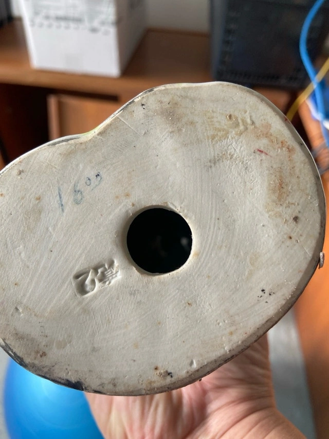 This captivating, used, antique figurine stands approximately 8 inches tall and features a serene, wise figure holding a peach and a staff. The intricate details and vibrant colours make it a truly unique and eye-catching piece. It has a stamp on the bottom that I can not read. It would look amazing on your mantle!
