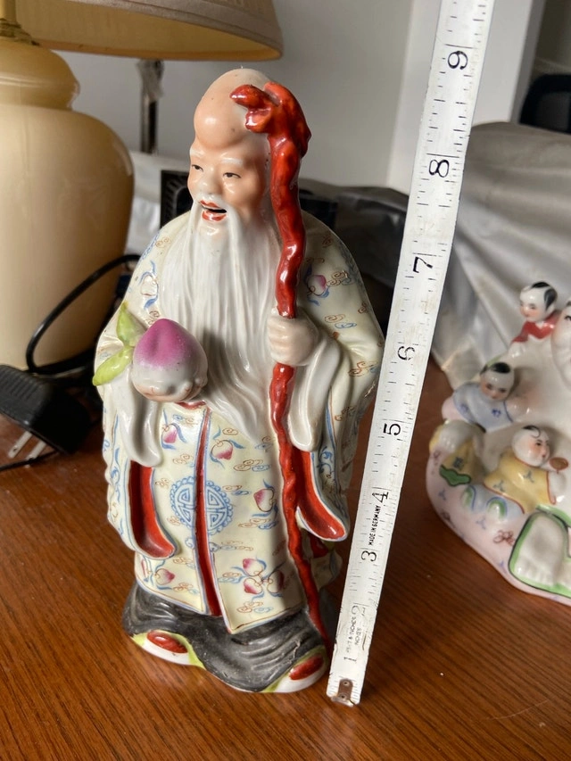 This captivating, used, antique figurine stands approximately 8 inches tall and features a serene, wise figure holding a peach and a staff. The intricate details and vibrant colours make it a truly unique and eye-catching piece. It has a stamp on the bottom that I can not read. It would look amazing on your mantle!