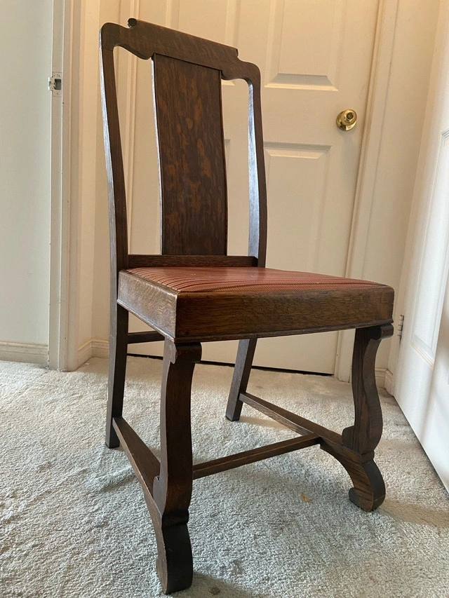 This is a set of 4 antique chairs with a unique design, perfect for adding character to any room. They are used chairs and have some wear, but are in good condition for their age. The chairs feature a sturdy wooden frame and a comfortable seat. They would look great in a living room, study, or bedroom.