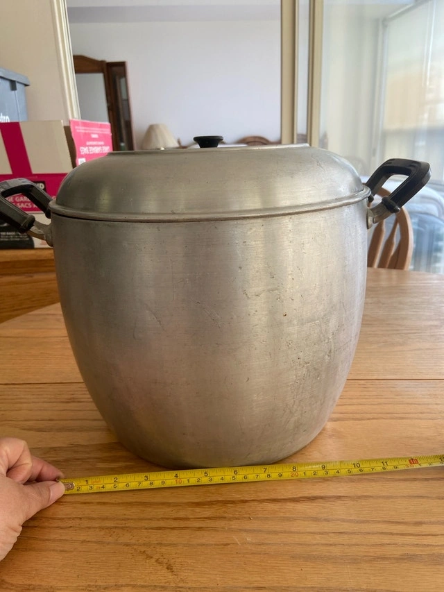 This is a used aluminum stock pot, perfect for large batch cooking! It measures approximately 11 inches in diameter and 11 inches in height. This pot has some cosmetic wear, but is still fully functional and ready for your next culinary adventure.