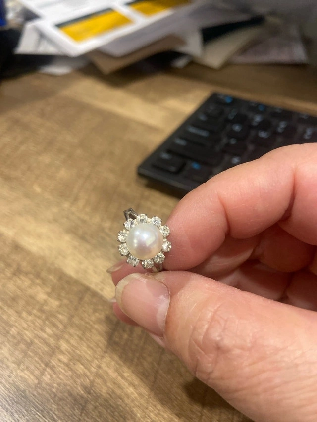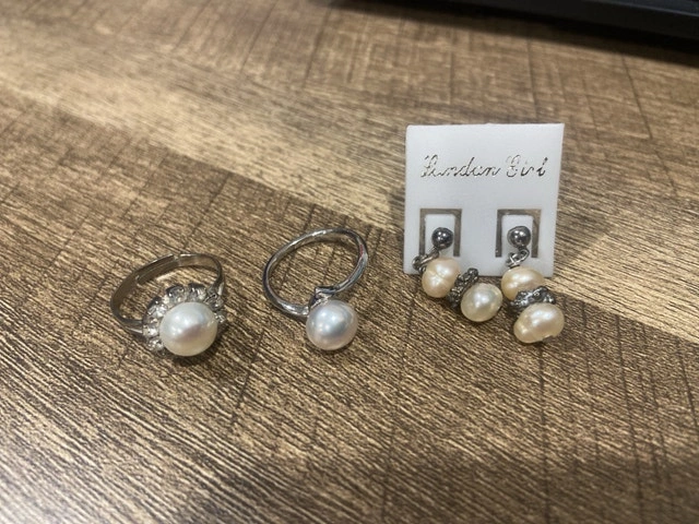 Elevate your style with this exquisite used pearl jewellery set, featuring lustrous pearl earrings and two elegant pearl rings, perfect for adding a touch of sophistication to any ensemble. The earrings are dangle earrings. These items are used and in good condition.