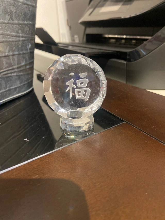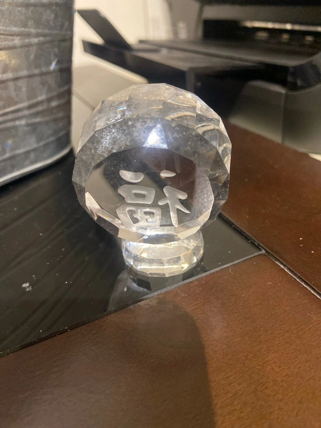 Add a touch of elegance to your space with this beautiful crystal ornament featuring a Chinese character. While it has been previously admired, its condition is still lovely, ready to catch the light and bring a bit of sparkle to your home. Perfect as a decorative piece or a thoughtful gift. 2.5 inches tall x 2 inches wide. Looking for a little sparkle? This crystal ornament is ready to find its forever home. If the ad is up, it's still available!