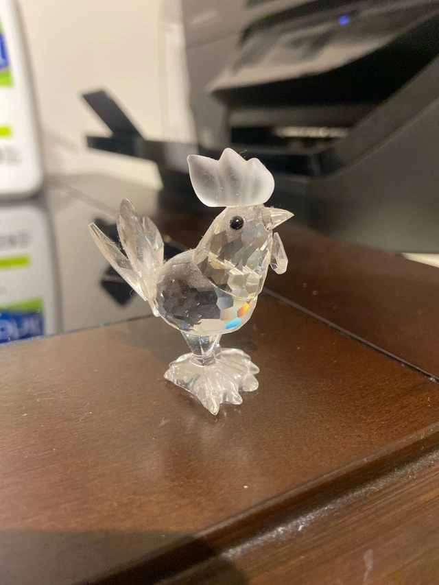 Add a touch of sparkle to your collection with this charming Swarovski Crystal Rooster figurine. This piece is in used condition, yet its brilliance remains undiminished, ready to brighten any display. The crystal is meticulously crafted with intricate details that capture the light beautifully. Stands 2 inches x 1.5 inches